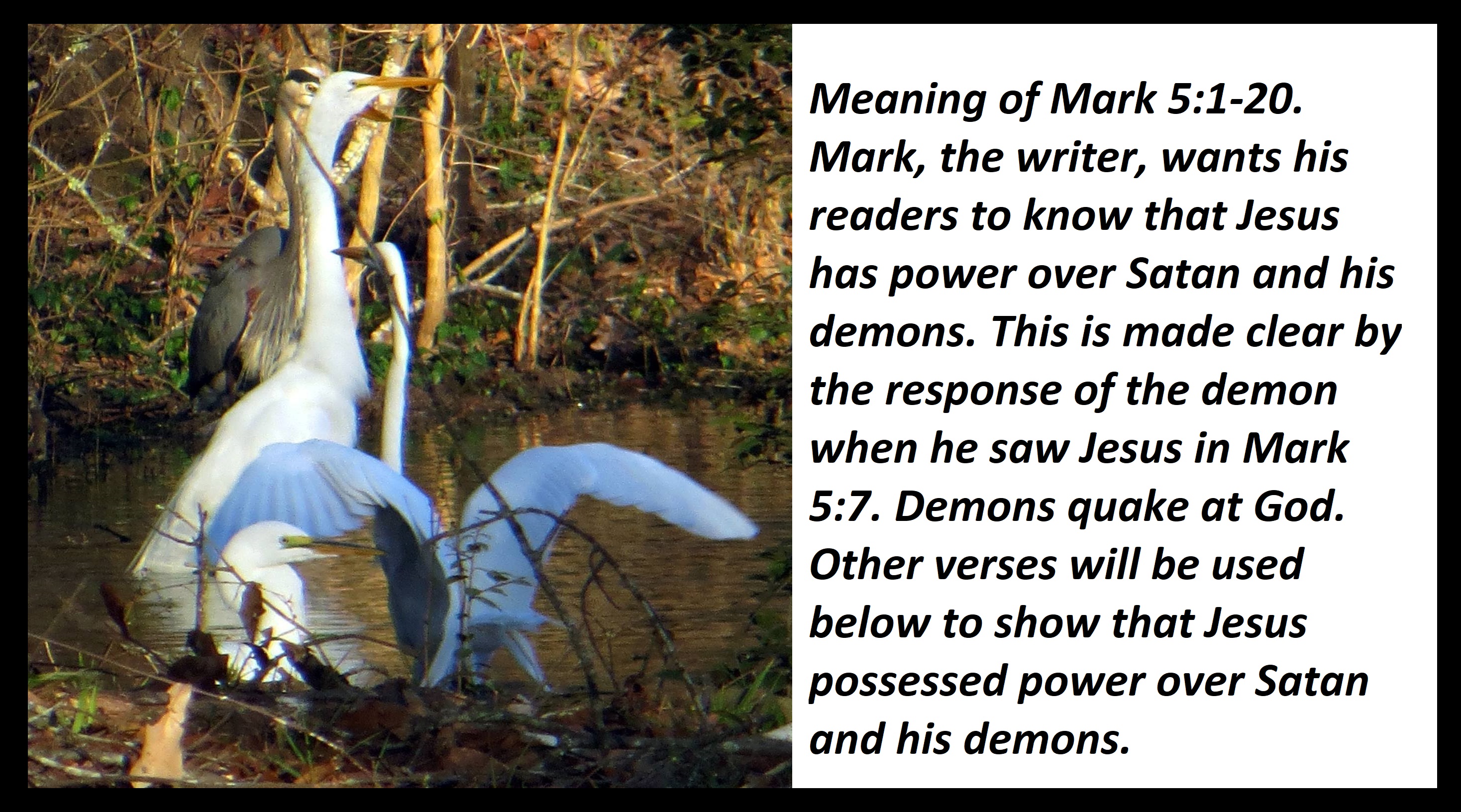 Meaning of Mark 5:1-20. Mark, the writer, wants his readers to know that Jesus has power over Satan and his demons. This is made clear by the response of the demon when he saw Jesus in Mark 5:7. Demons quake at God. Other verses will be used below to show that Jesus possessed power over Satan and his demons.