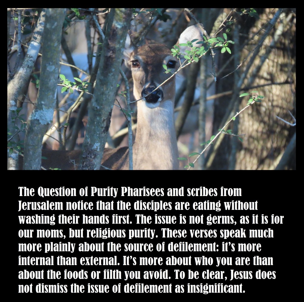The Question of Purity Pharisees and scribes from Jerusalem notice that the disciples are eating without washing their hands first. The issue is not germs, as it is for our moms, but religious purity. These verses speak much more plainly about the source of defilement: it’s more internal than external. It’s more about who you are than about the foods or filth you avoid. To be clear, Jesus does not dismiss the issue of defilement as insignificant.
