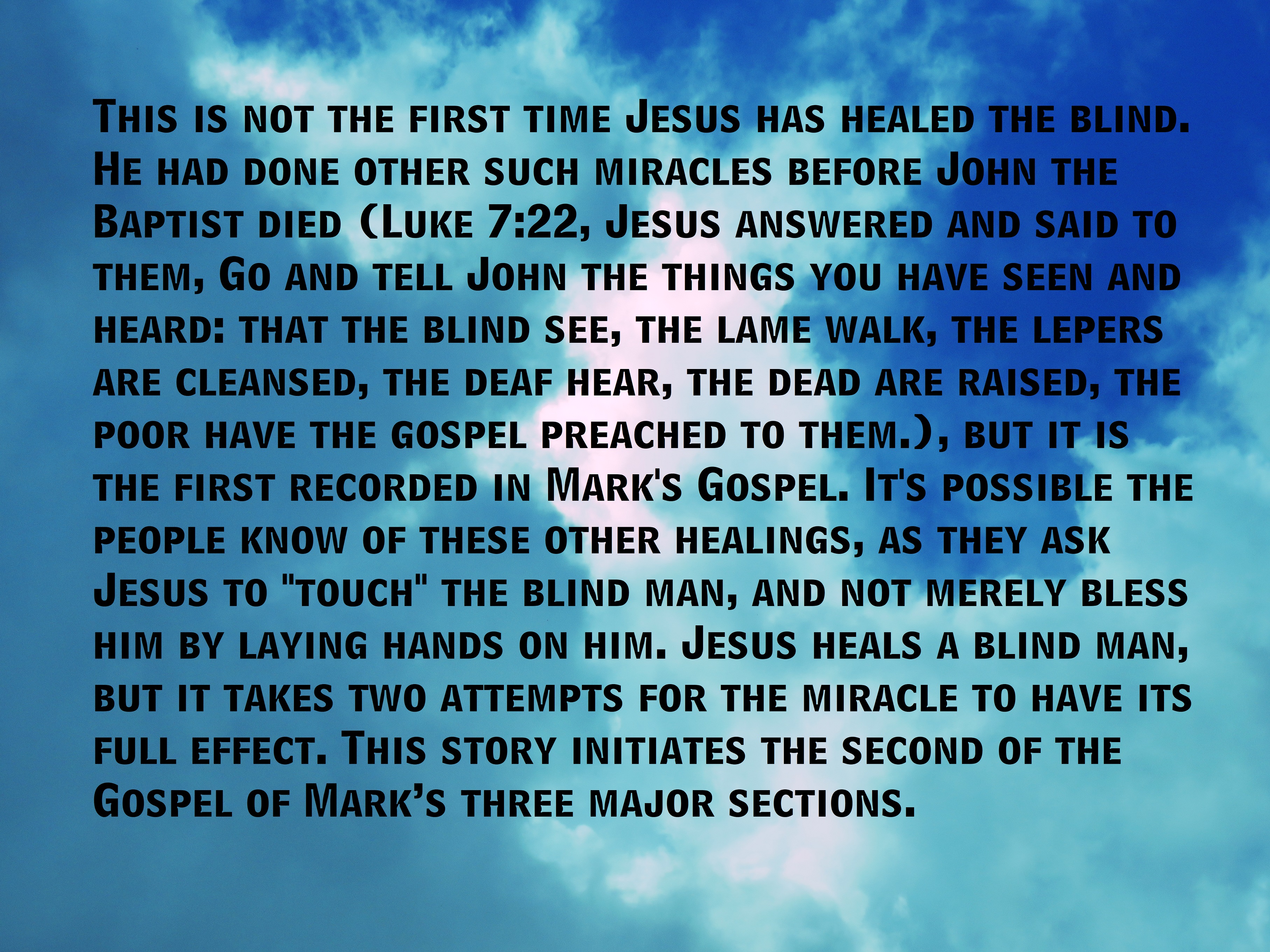 This is not the first time Jesus has healed the blind. He had done other such miracles before John the Baptist died (Luke 7:22, Jesus answered and said to them, “Go and tell John the things you have seen and heard: that the blind see, the lame walk, the lepers are cleansed, the deaf hear, the dead are raised, the poor have the gospel preached to them.), but it is the first recorded in Mark’s Gospel. It’s possible the people know of these other healings, as they ask Jesus to “touch” the blind man, and not merely bless him by laying hands on him. Jesus heals a blind man, but it takes two attempts for the miracle to have its full effect. This story initiates the second of the Gospel of Mark’s three major sections.