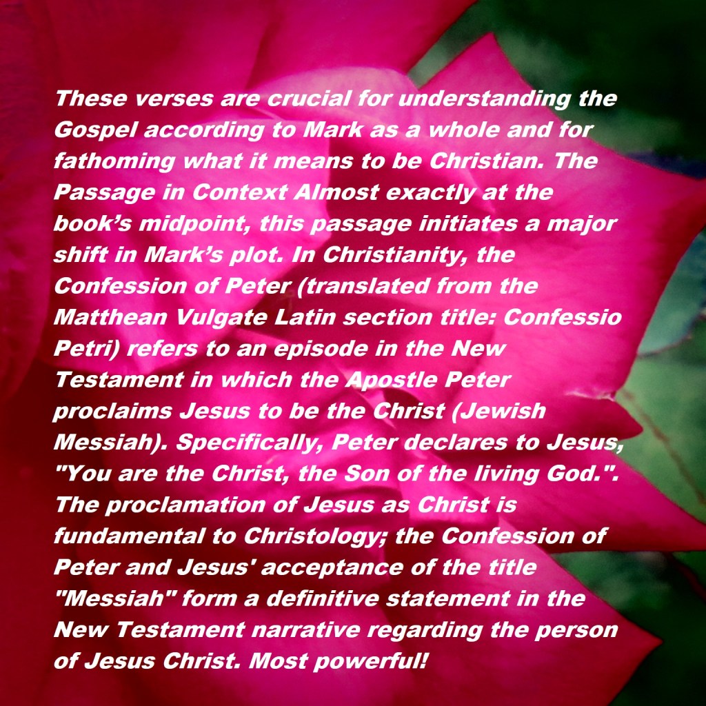 These verses are crucial for understanding the Gospel according to Mark as a whole and for fathoming what it means to be Christian. The Passage in Context Almost exactly at the book’s midpoint, this passage initiates a major shift in Mark’s plot. In Christianity, the Confession of Peter (translated from the Matthean Vulgate Latin section title: Confessio Petri) refers to an episode in the New Testament in which the Apostle Peter proclaims Jesus to be the Christ (Jewish Messiah). Specifically, Peter declares to Jesus, “You are the Christ, the Son of the living God.”. The proclamation of Jesus as Christ is fundamental to Christology; the Confession of Peter and Jesus’ acceptance of the title “Messiah” form a definitive statement in the New Testament narrative regarding the person of Jesus Christ. Most powerful!