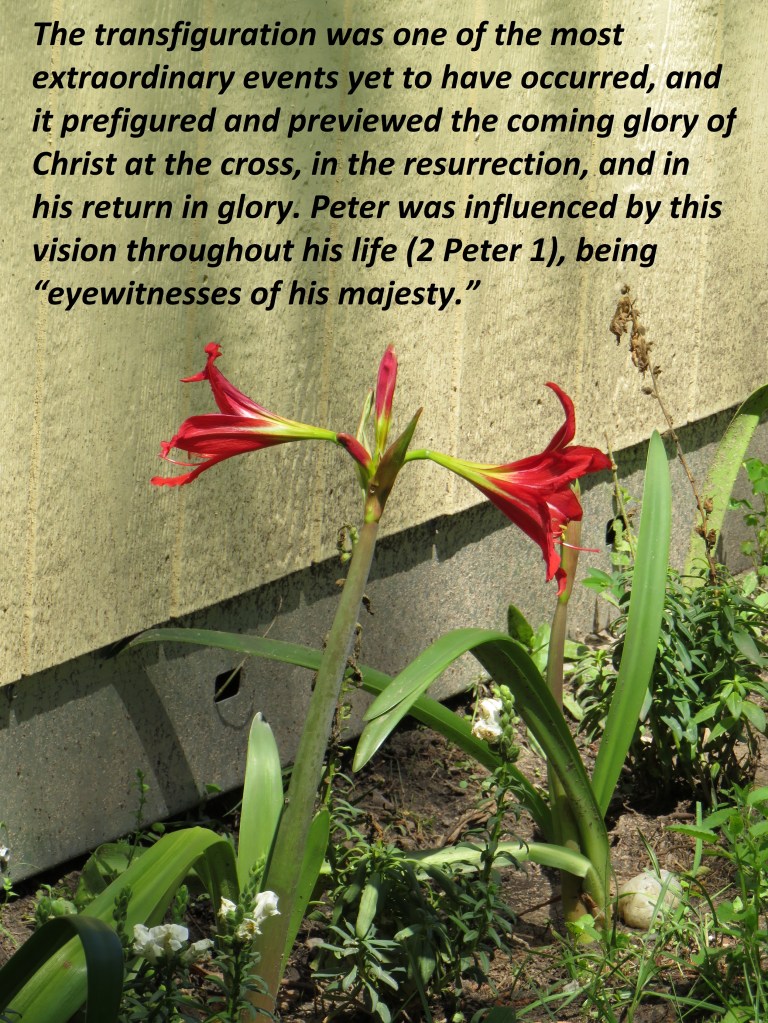 The transfiguration was one of the most extraordinary events yet to have occurred, and it prefigured and previewed the coming glory of Christ at the cross, in the resurrection, and in his return in glory. Peter was influenced by this vision throughout his life (2 Peter 1), being “eyewitnesses of his majesty.”