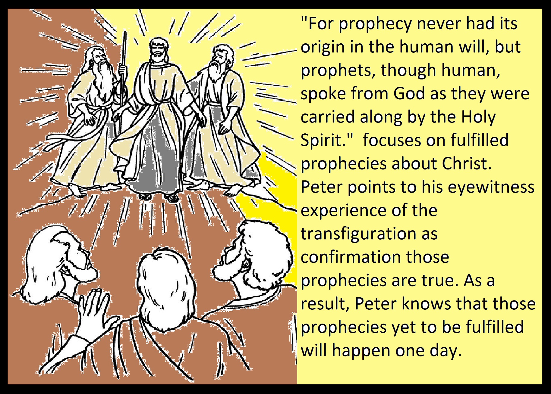 “For prophecy never had its origin in the human will, but prophets, though human, spoke from God as they were carried along by the Holy Spirit.” focuses on fulfilled prophecies about Christ. Peter points to his eyewitness experience of the transfiguration as confirmation those prophecies are true. As a result, Peter knows that those prophecies yet to be fulfilled will happen one day.