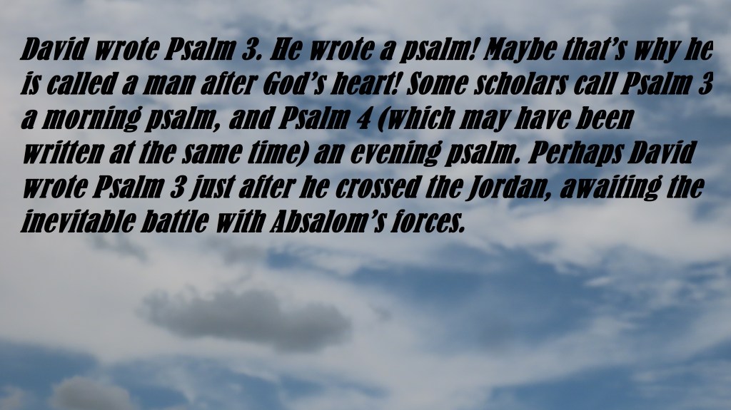 David wrote Psalm 3. He wrote a psalm! Maybe that’s why he is called a man after God’s heart! Some scholars call Psalm 3 a morning psalm, and Psalm 4 (which may have been written at the same time) an evening psalm. Perhaps David wrote Psalm 3 just after he crossed the Jordan, awaiting the inevitable battle with Absalom’s forces.