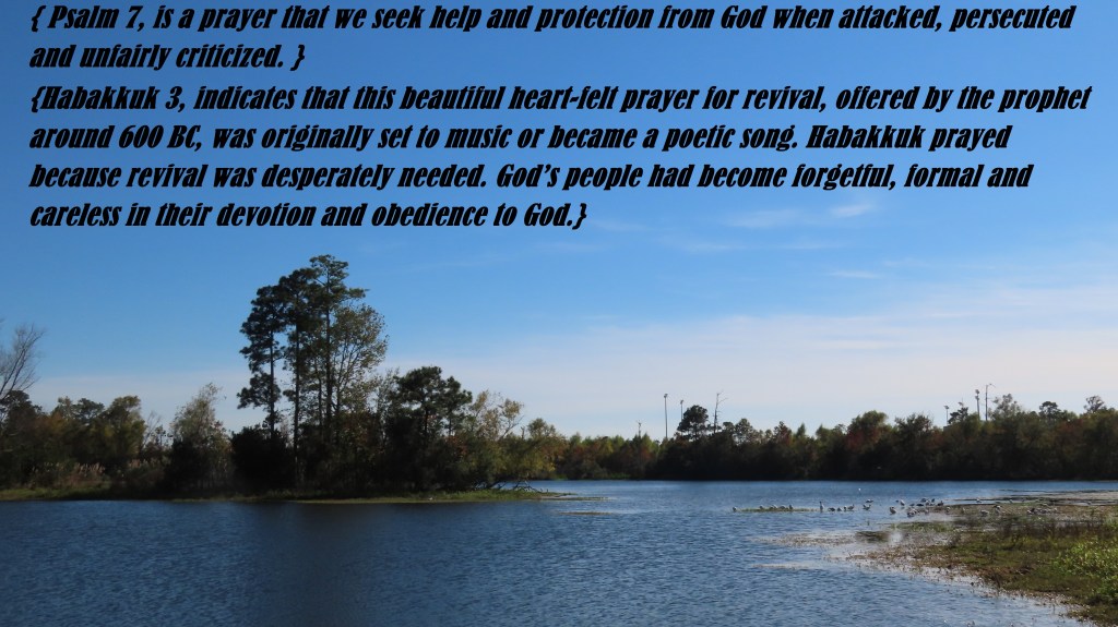 Psalm 7 is the 7th psalm from the Book of Psalms. Its authorship is traditionally assigned to King David. The Greek and Masoretic numberings are the same for this psalm. The message in the psalm is that the righteous may seem weak, but ultimately will prevail against the wicked. “Psalm 7”: The superscription indicates that the psalm was written while David was being ruthlessly assailed by “Cush the Benjamite”, who was evidently one of Saul’s radical kinsmen. David is confident in both his own innocence (verses 3-5), and the certainty of divine retribution on the much-deserving Cush (verses 6-17). A cry for salvation. It is a call for help and an appeal for justice against those who hounded him. “O Lord my God,” was his intense cry, “in You have I taken refuge. Save me from all who pursue me.. and deliver me.” SHIGGAION. shi-ga’-yon, shi-gi’-on (shiggayon)(Means to wander): Occurs in the title of Psalm 7, and, in the plural, in the verse introducing Habakkuk’s prayer (Habakkuk 3:1-19, A prayer of Habakkuk the prophet. On shigionoth. Lord, I have heard of your fame; I stand in awe of your deeds, Lord. Repeat them in our day, in our time make them known; in wrath remember mercy. God came from Teman, the Holy One from Mount Paran. His glory covered the heavens and his praise filled the earth. His splendor was like the sunrise; rays flashed from his hand, where his power was hidden. Plague went before him; pestilence followed his steps. He stood, and shook the earth; he looked, and made the nations tremble. The ancient mountains crumbled and the age-old hills collapsed— but he marches on forever. I saw the tents of Cushan in distress, the dwellings of Midian in anguish. Were you angry with the rivers, Lord? Was your wrath against the streams? Did you rage against the sea when you rode your horses and your chariots to victory? You uncovered your bow, you called for many arrows. You split the earth with rivers; the mountains saw you and writhed. Torrents of water swept by; the deep roared and lifted its waves on high. Sun and moon stood still in the heavens at the glint of your flying arrows, at the lightning of your flashing spear. In wrath you strode through the earth and in anger you threshed the nations. You came out to deliver your people, to save your anointed one. You crushed the leader of the land of wickedness, you stripped him from head to foot. With his own spear you pierced his head when his warriors stormed out to scatter us, gloating as though about to devour the wretched who were in hiding. You trampled the sea with your horses, churning the great waters. I heard and my heart pounded, my lips quivered at the sound; decay crept into my bones, and my legs trembled. Yet I will wait patiently for the day of calamity to come on the nation invading us. Though the fig tree does not bud and there are no grapes on the vines, though the olive crop fails and the fields produce no food, though there are no sheep in the pen and no cattle in the stalls, yet I will rejoice in the Lord, I will be joyful in God my Savior. The Sovereign Lord is my strength; he makes my feet like the feet of a deer, he enables me to tread on the heights. For the director of music. On my stringed instruments., ).Derived from a verb meaning “to wander,” it is generally taken to mean a dithyramb, or rhapsody.) Habakkuk’s prayer of praise in the form of a poetic song. He had been given the vision from God concerning the end; he had heard the Lord’s response to his questions and concerns. The word prayer is here taken in a general sense for an act or exercise of devotion, including adoration, praise, and thanksgiving.