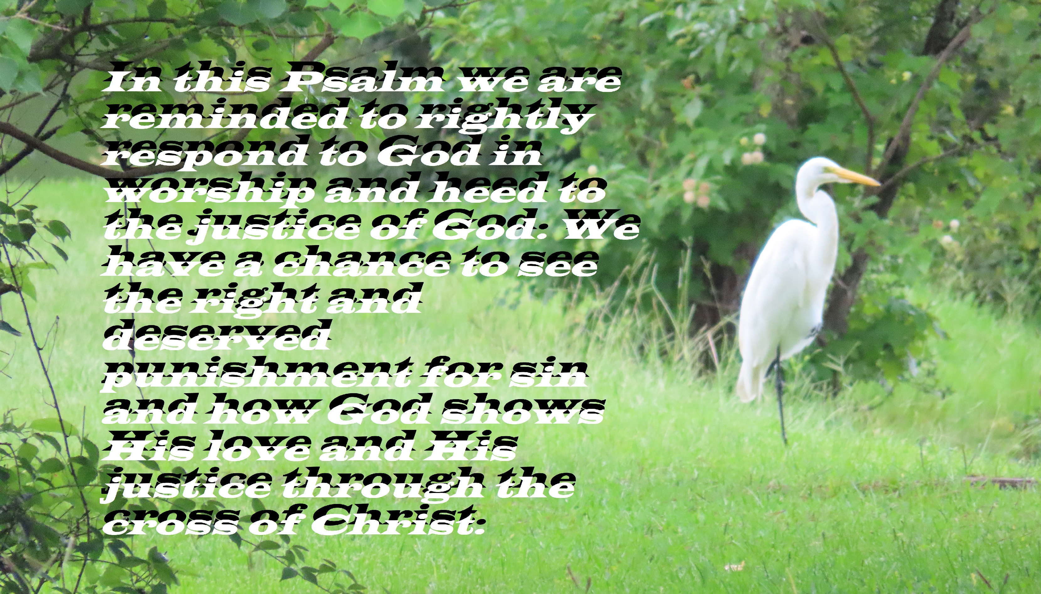 In this Psalm we are reminded to rightly respond to God in worship and heed to the justice of God. We have a chance to see the right and deserved punishment for sin and how God shows His love and His justice through the cross of Christ.