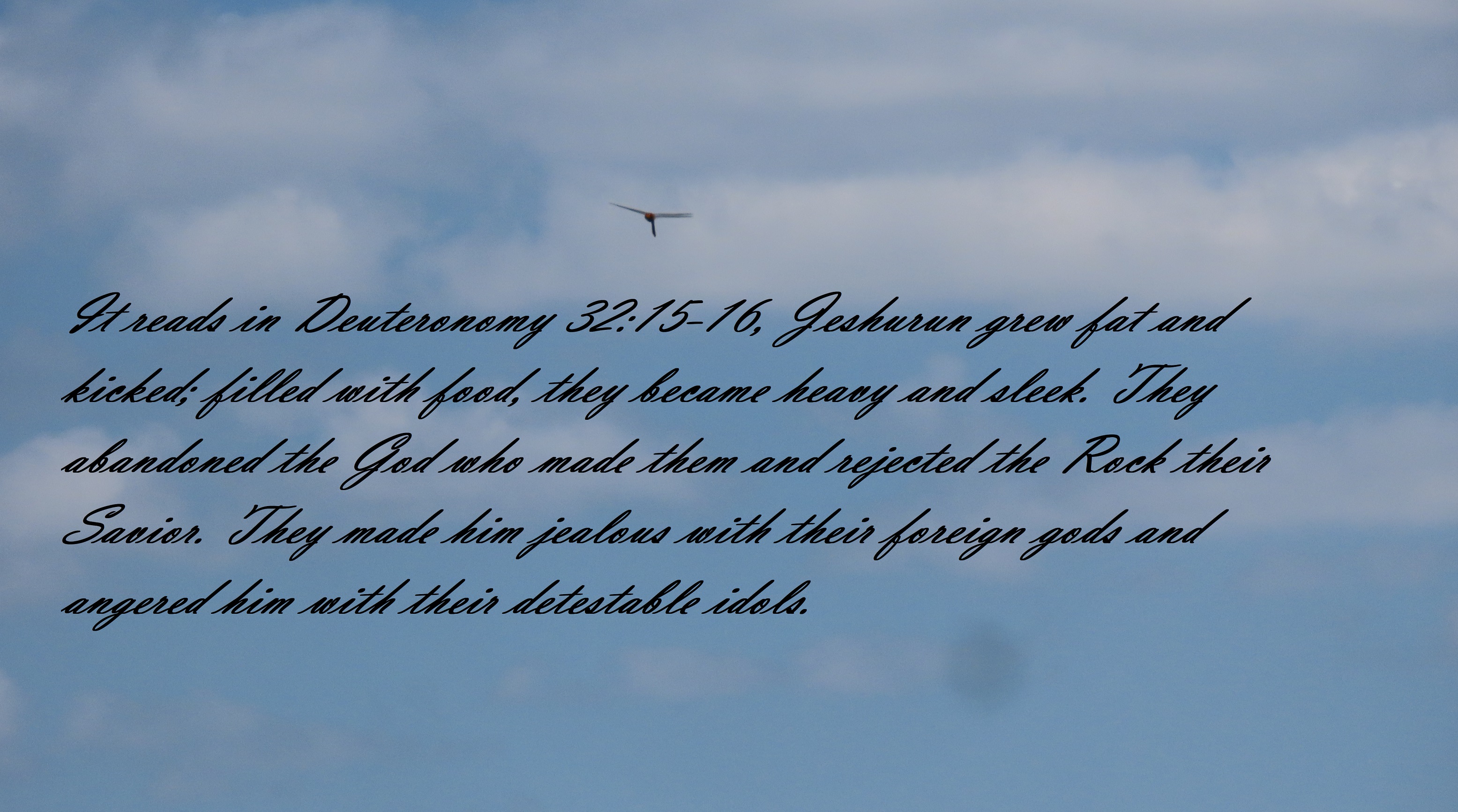 It reads in Deuteronomy 32:15-16, Jeshurun grew fat and kicked; filled with food, they became heavy and sleek. They abandoned the God who made them and rejected the Rock their Savior. They made him jealous with their foreign gods and angered him with their detestable idols.