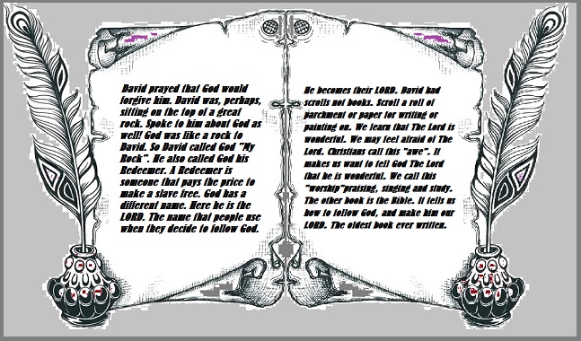 We definitely don’t know when David wrote Psalm 19. Maybe it was one morning when he had been out all night with his sheep. He saw the sunrise over Moab. David spoke about God in awe. David remembered the stars that he saw at night. God made the heavens and stars. In the morning David saw the sun rise. God made the sun. All that David saw told himself about God. He heard no words, there was no language. David knew that everything was showing and telling him about God. David remembered something else. He remembered the word of God. Called the Bible. Bible tells him about God as well. David did not have the whole Bible. He only had the start of the Old Testament. Which he was able to read about God. This made David very happy. It also made David think. Gods wants a us to think. That is why God gave us a powerful mind. So we can create right with Him. It David him say to himself, “Am I a good or bad man?” David prayed that God would forgive him. David was, perhaps, sitting on the top of a great rock. Spoke to him about God as well! God was like a rock to David. So David called God “My Rock”. He also called God his Redeemer. A Redeemer is someone that pays the price to make a slave free. God has a different name. Here he is the LORD. The name that people use when they decide to follow God. He becomes their LORD. David had scrolls not books. Scroll a roll of parchment or paper for writing or painting on. We learn that The Lord is wonderful. We may feel afraid of The Lord. Christians call this “awe”. It makes us want to tell God The Lord that he is wonderful. We call this “worship” “praising”, “singing” and study. Refrain! Oh! The other book is the Bible. It tells us how to follow God and make him our LORD. The oldest book ever written.