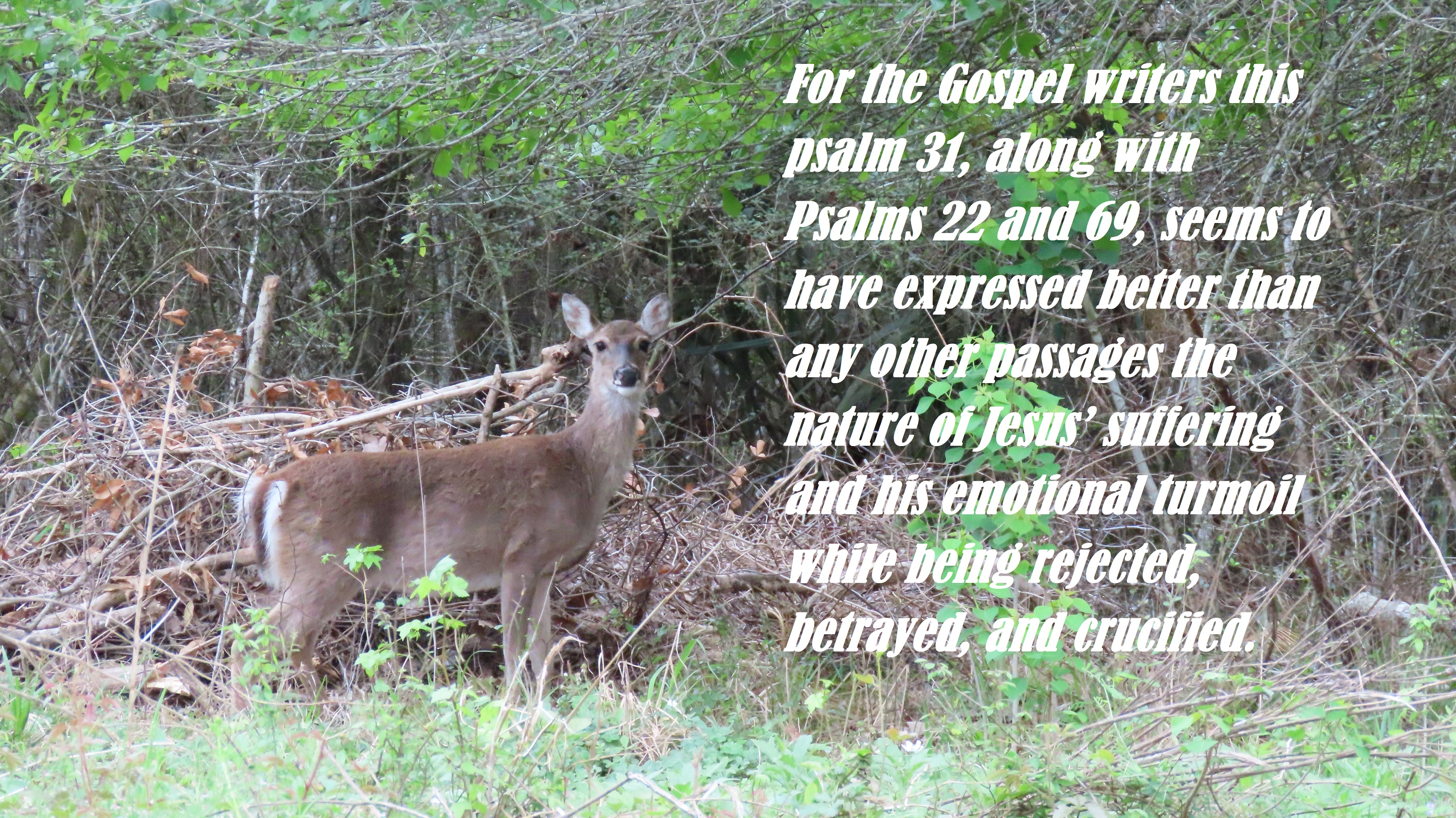 David begins this psalm with a prayer for deliverance from his enemies and for guidance. Psalm 31 is a lament psalm in which David is trying to work through a problem in his life with the Lord’s help. That problem, as it turns out, is his son Absalom entering into Jerusalem to kill his own father. He trusts in the Lord for stability, security, and protection. Everything, including David’s life, is placed in God’s care. David praises God for the times when he experienced divine rescue. Jesus taught us to love the Lord by preaching, even giving his life for it, and especially taught us to have confidence in Him. In these one of three chapters of psalms that appear prominently in the story of Jesus’ passion. For the Gospel writers this psalm 31, along with Psalms 22 and 69, seems to have expressed better than any other passages the nature of Jesus’ suffering and his emotional turmoil while being rejected, betrayed, and crucified.