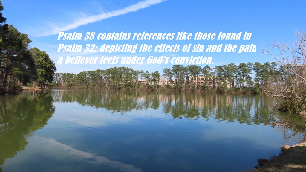 Psalm 38 contains references like those found in Psalm 32: depicting the effects of sin and the pain a believer feels under God’s conviction. It’s possible this passage was composed in response to David’s sin with Bathsheba. Nothing will disquiet the heart of a good man so much as the sense of God’s anger. The way to keep the heart quiet, is to keep ourselves in the love of God. This is one of the penitential psalms; it is full of grief and complaint from the beginning to the end. David is rehearsing the fact that his sin has caused God to single him out. As a result, David is suffering physically and emotionally.