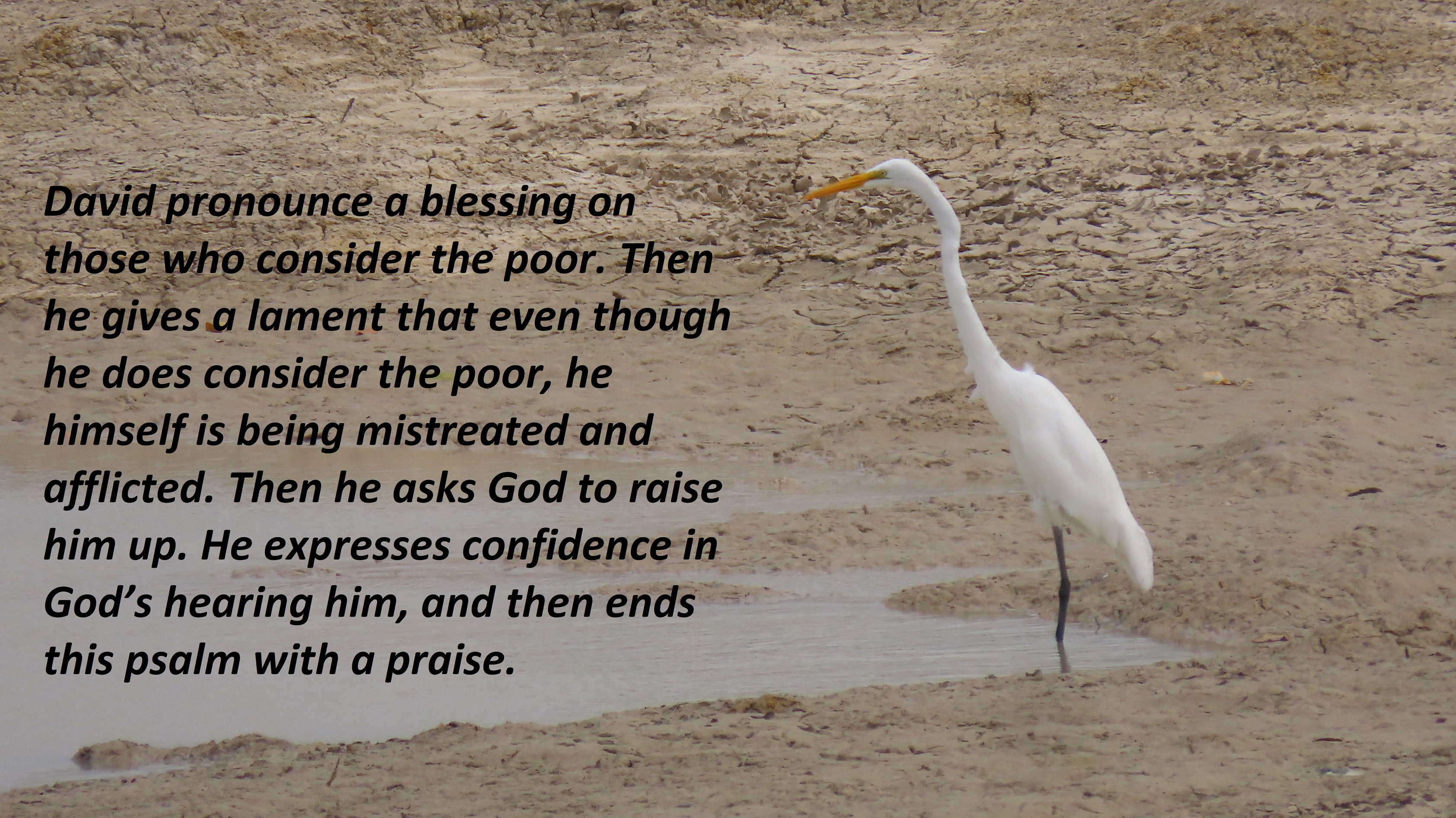 Psalm 41 is a lament psalm. In it, we’ll see David pronounce a blessing on those who consider the poor. Then he gives a lament that even though he does consider the poor, he himself is being mistreated and afflicted. Then he asks God to raise him up. He expresses confidence in God’s hearing him, and then ends this psalm with a praise. The believer who reaches out to the poor will experience God’s mercy in spite of personal failure, physical illness, opposition from enemies, and betrayal by friends. Furthermore, God’s mercy will extend beyond the believer’s earthly life into eternity. Written: About 1000 BC. Many of the Bible’s Psalms, which were written before the time of Jesus, contain details that foreshadowed events in the life of Jesus. In Psalm 41, for example, the psalmist wrote of being betrayed by a friend, someone close enough to have shared food with him (verse 9).