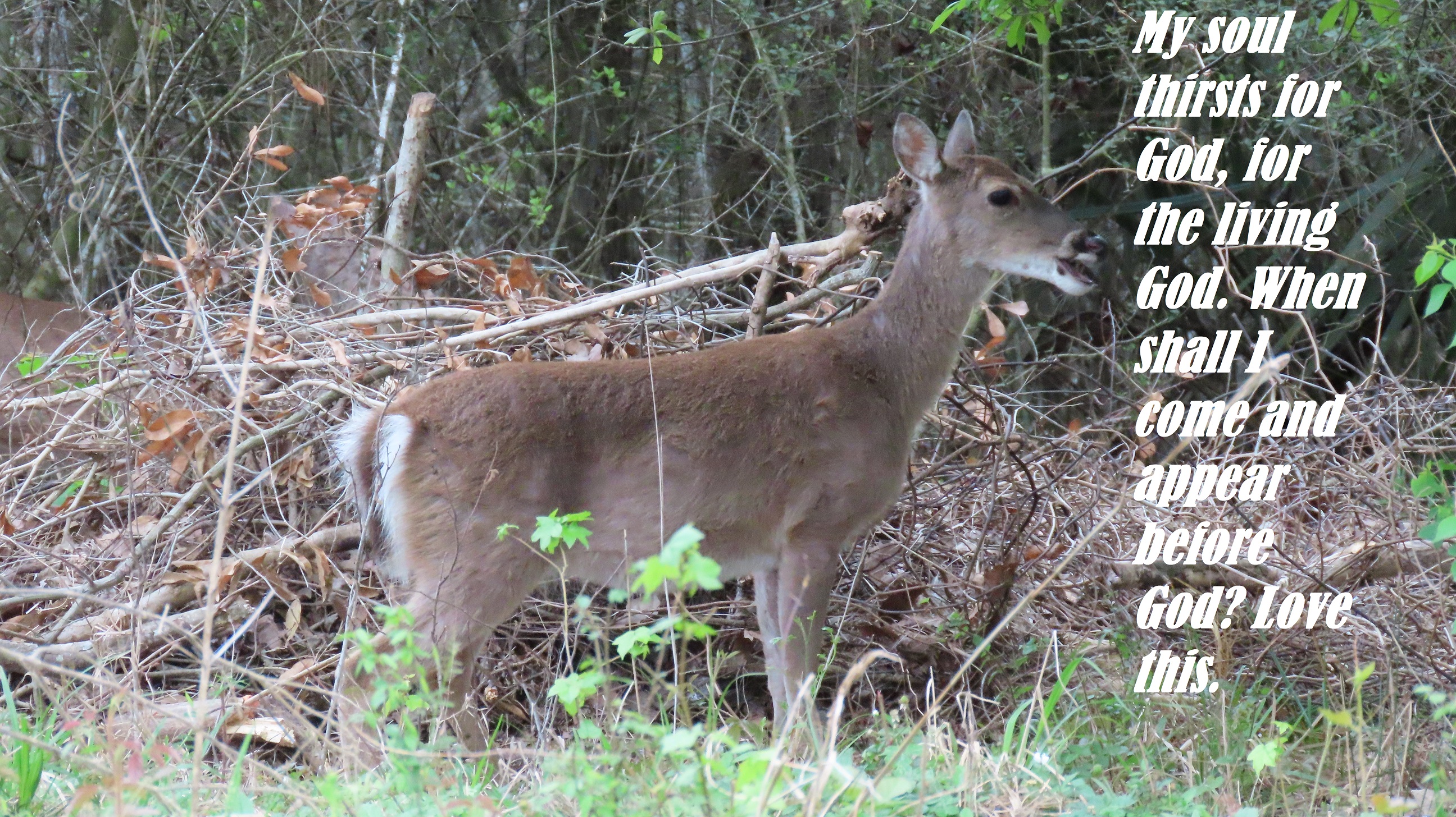 As the hart panteth after the water brooks, so panteth my soul after thee, O God. My soul thirsteth for God, for the living God: when shall I come and appear before God? My tears have been my meat day and night, while they continually say unto me, Where is thy God? When I remember these things, I pour out my soul in me: for I had gone with the multitude, I went with them to the house of God, with the voice of joy and praise, with a multitude that kept holyday. Why art thou cast down, O my soul? and why art thou disquieted in me? hope thou in God: for I shall yet praise him for the help of his countenance. O my God, my soul is cast down within me: therefore will I remember thee from the land of Jordan, and of the Hermonites, from the hill Mizar. Deep calleth unto deep at the noise of thy waterspouts: all thy waves and thy billows are gone over me. Yet the Lord will command his lovingkindness in the day time, and in the night his song shall be with me, and my prayer unto the God of my life. I will say unto God my rock, Why hast thou forgotten me? why go I mourning because of the oppression of the enemy? As with a sword in my bones, mine enemies reproach me; while they say daily unto me, Where is thy God? Why art thou cast down, O my soul? and why art thou disquieted within me? hope thou in God: for I shall yet praise him, who is the health of my countenance, and my God.