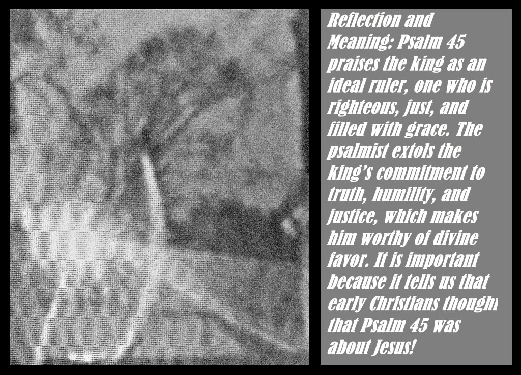 Reflection and Meaning: Psalm 45 praises the king as an ideal ruler, one who is righteous, just, and filled with grace. The psalmist extols the king’s commitment to truth, humility, and justice, which makes him worthy of divine favor. It is important because it tells us that early Christians thought that this Psalm was about Jesus! So, it does not matter that it may have been about the King of Judah. It is now about Jesus! Read about the ‘sons of Korah’ at the end of Psalm 43 in this set of psalms. Read Psalm 45: 2 – 9. How many things can you find that remind you of This Psalm shows a striking interaction between the Persons of the Trinity. “God, Your God” speaks of the Father and His position of authority over the Second Person of the Trinity. “ You ” refers to the Son. “Anointed ” has in mind the ministry and presence of the Holy Spirit, the Third Person of the Trinity. In the Siddur Avodas Yisrael, this Psalm is recited as a Song of the Day on Shabbat Chayei Sarah and Shabbat Pekudei. This psalm is said as a general prayer for the end of the exile and the coming of the Mashiach. Moshiach is the Hebrew word for “messiah.”. The word messiah in English means a savior or a “hoped-for deliverer.”. The word Moshiach in Hebrew actually means “anointed.”. In Biblical Hebrew, the title Moshiach was bestowed on somebody who had attained a position of nobility and greatness.. The power and person of this King. The gride of this great King and the nature of His kingdom. Really surrender to Jesus as LORD means that one gives up his own will. He has no will of his own.