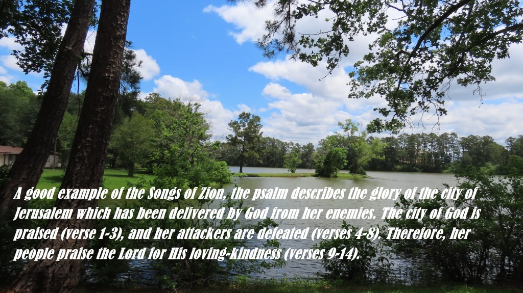 Psalm 48 Meaning. The meaning of Psalm 48 is very interesting, its authors (the children of Core) declare their gratitude to God, in it we can see two reasons: his love and his care. The Psalms also tells us that the place or home of God is the Church and that it is there where he lives. It is from the Church where his whole being is born and expands to others. A good example of the Songs of Zion, the psalm describes the glory of the city of Jerusalem which has been delivered by God from her enemies. The city of God is praised (verse 1-3), and her attackers are defeated (verses 4-8). Therefore, her people praise the Lord for His loving-kindness (verses 9-14).