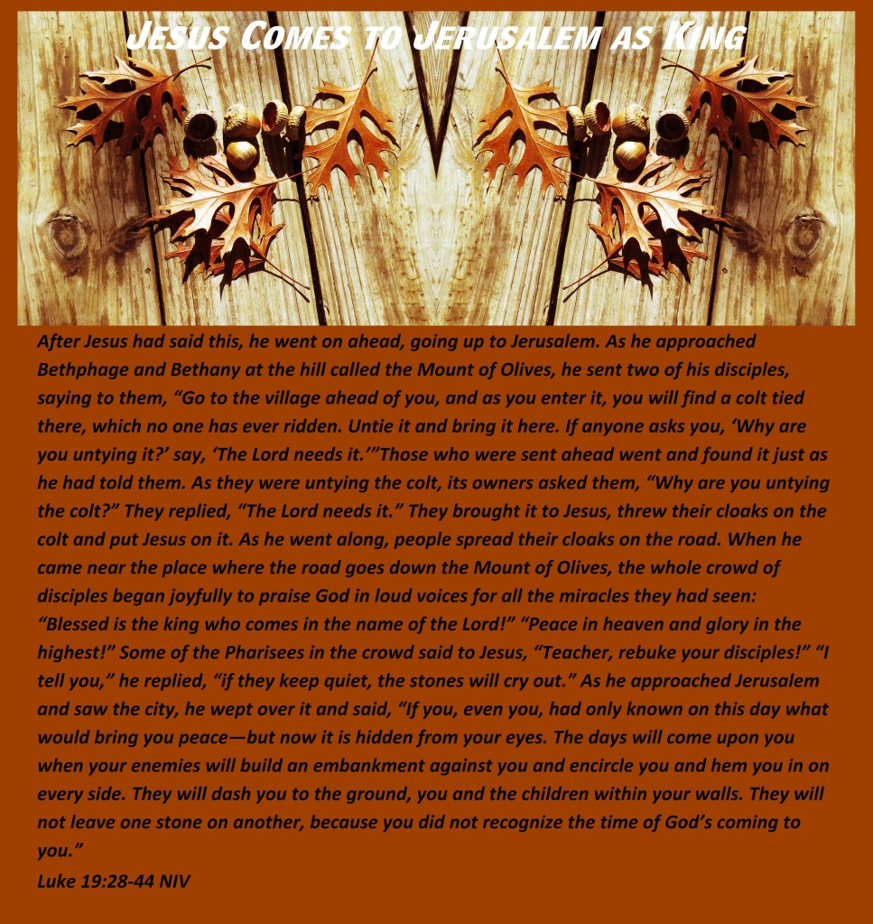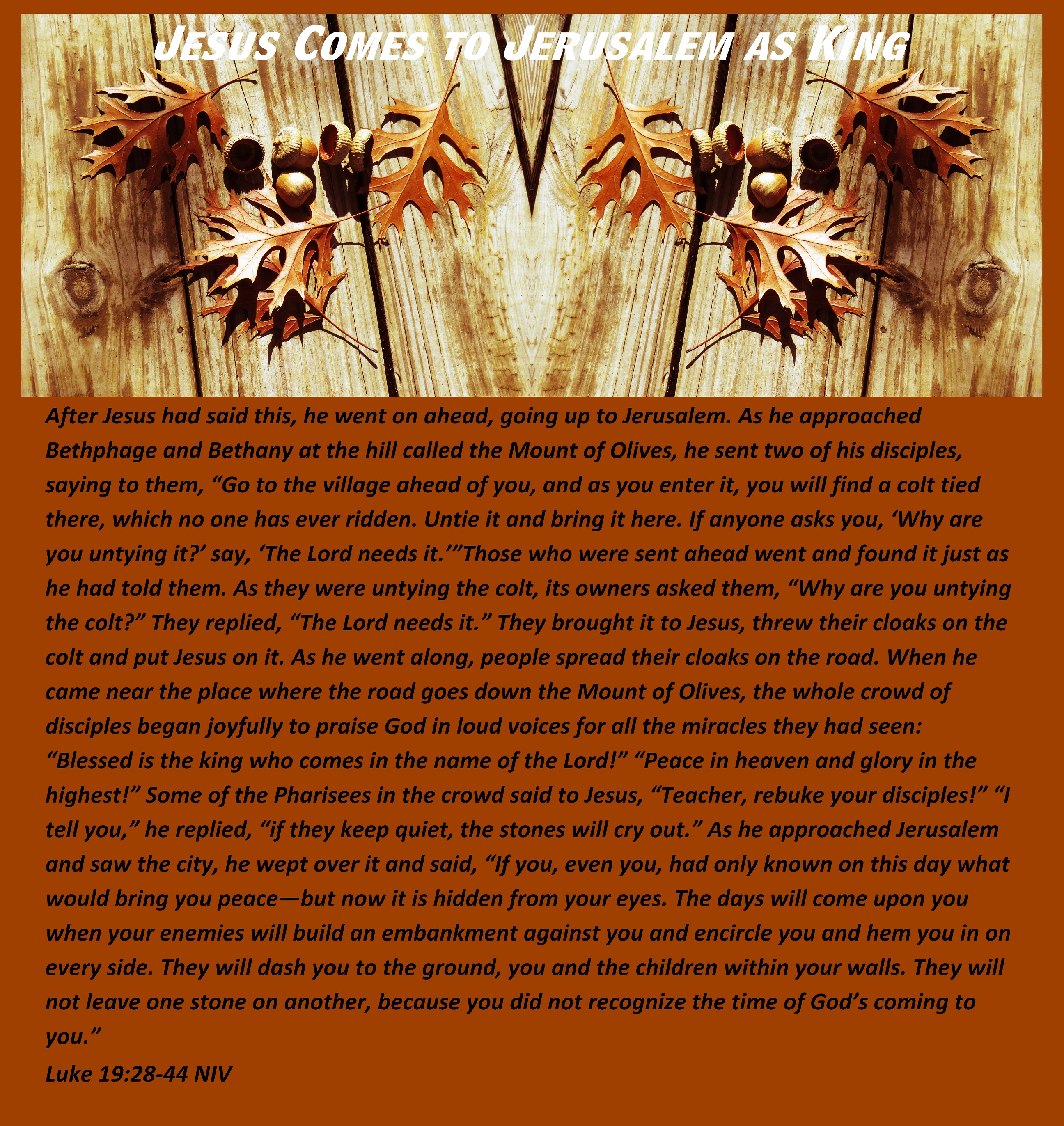 After Jesus had said this, he went on ahead, going up to Jerusalem. As he approached Bethphage and Bethany at the hill called the Mount of Olives, he sent two of his disciples, saying to them, “Go to the village ahead of you, and as you enter it, you will find a colt tied there, which no one has ever ridden. Untie it and bring it here. If anyone asks you, ‘Why are you untying it?’ say, ‘The Lord needs it.’”Those who were sent ahead went and found it just as he had told them. As they were untying the colt, its owners asked them, “Why are you untying the colt?” They replied, “The Lord needs it.” They brought it to Jesus, threw their cloaks on the colt and put Jesus on it. As he went along, people spread their cloaks on the road. When he came near the place where the road goes down the Mount of Olives, the whole crowd of disciples began joyfully to praise God in loud voices for all the miracles they had seen: “Blessed is the king who comes in the name of the Lord!” “Peace in heaven and glory in the highest!” Some of the Pharisees in the crowd said to Jesus, “Teacher, rebuke your disciples!” “I tell you,” he replied, “if they keep quiet, the stones will cry out.” As he approached Jerusalem and saw the city, he wept over it and said, “If you, even you, had only known on this day what would bring you peace—but now it is hidden from your eyes. The days will come upon you when your enemies will build an embankment against you and encircle you and hem you in on every side. They will dash you to the ground, you and the children within your walls. They will not leave one stone on another, because you did not recognize the time of God’s coming to you.”