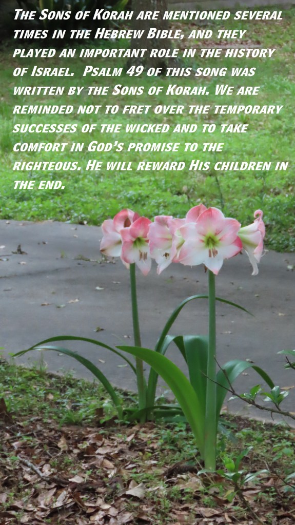 Psalm 49 is a psalm for the recession. The reality in this world of wicked men who are also powerful is a dreadful one. We know that God is all-powerful and that he hates evil. And yet, he seems to at least permit the existence of wicked men in this world, who are not only allowed to exist in God’s world. but they’re also really rich and powerful and influential. Its theme is the failure of living for this world’s possessions, status, and fame, in light of the certainty of death. It is a “wisdom” psalm, similar in theme to Psalms 37 and 73. Confidence in God Rather than in Riches. The Sons of Korah were a group of Levites who were descended from the biblical figure Korah. Korah was a member of the tribe of Levi and he had two sons, Assir and Elkanah. The Sons of Korah are mentioned several times in the Hebrew Bible, and they played an important role in the history of Israel. Psalm 49 of this song was written by the Sons of Korah. We are reminded not to fret over the temporary successes of the wicked and to take comfort in God’s promise to the righteous. He will reward His children in the end.