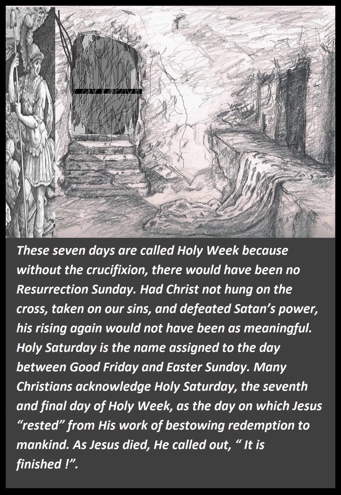 These seven days are called Holy Week because without the crucifixion, there would have been no Resurrection Sunday. Had Christ not hung on the cross, taken on our sins, and defeated Satan’s power, his rising again would not have been as meaningful. Holy Saturday is the name assigned to the day between Good Friday and Easter Sunday. Many Christians acknowledge Holy Saturday, the seventh and final day of Holy Week, as the day on which Jesus “rested” from His work of bestowing redemption to mankind. As Jesus died, He called out, “It is finished!”.