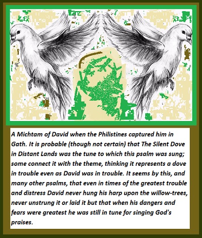 (To the choirmaster: according to The Dove on Far-off Terebinths. A Miktam of David, when the Philistines seized him in Gath.)