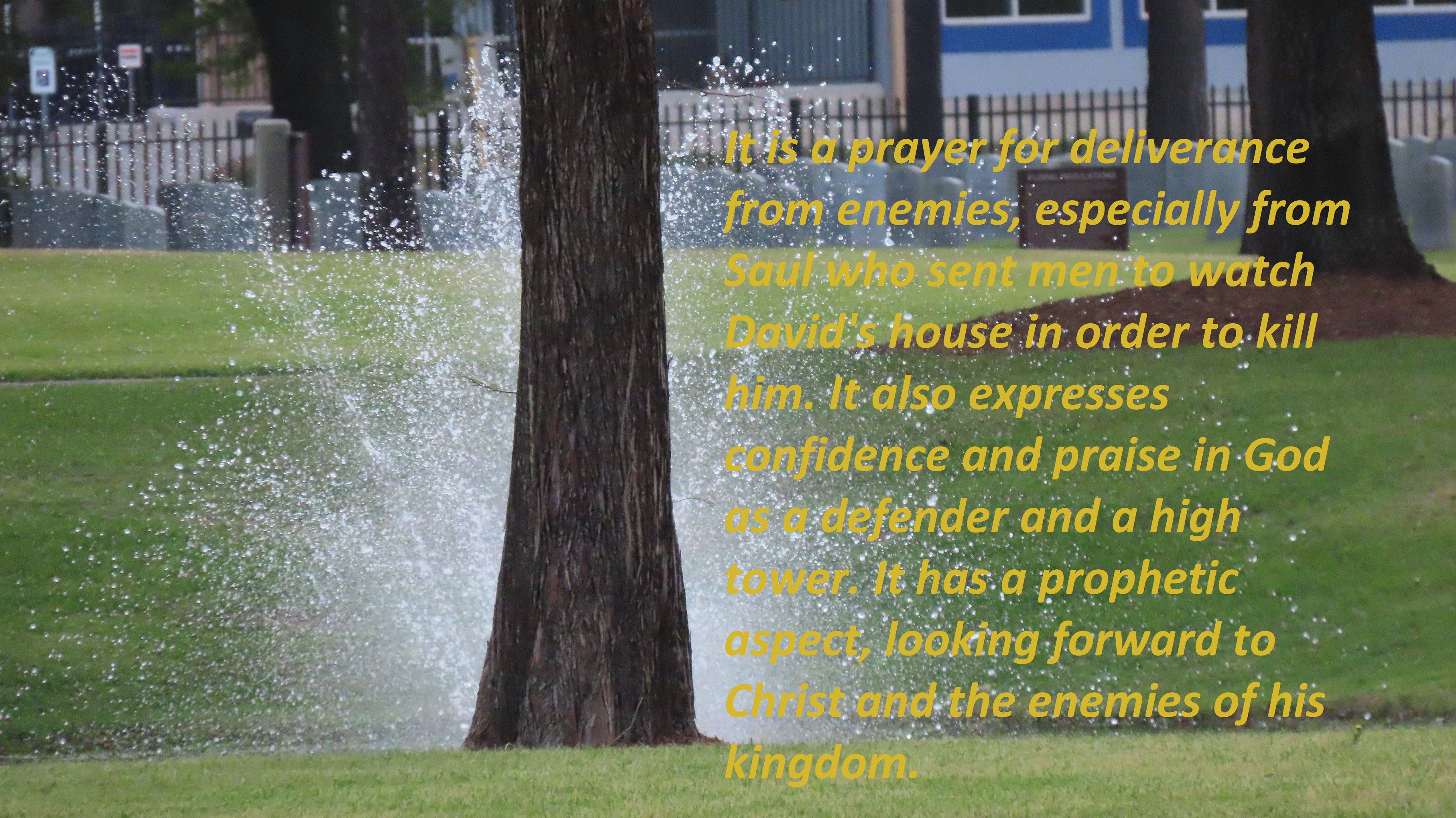 Psalm 59 – NIV: Deliver me from my enemies, O God; be my fortress against those who are attacking me. Deliver me from evildoers and save me from those who are after my blood. Psalm of David, a Michtam, set to “Do Not Destroy”. It is a prayer for deliverance from enemies, especially from Saul who sent men to watch David’s house in order to kill him. It also expresses confidence and praise in God as a defender and a high tower. It has a prophetic aspect, looking forward to Christ and the enemies of his kingdom.