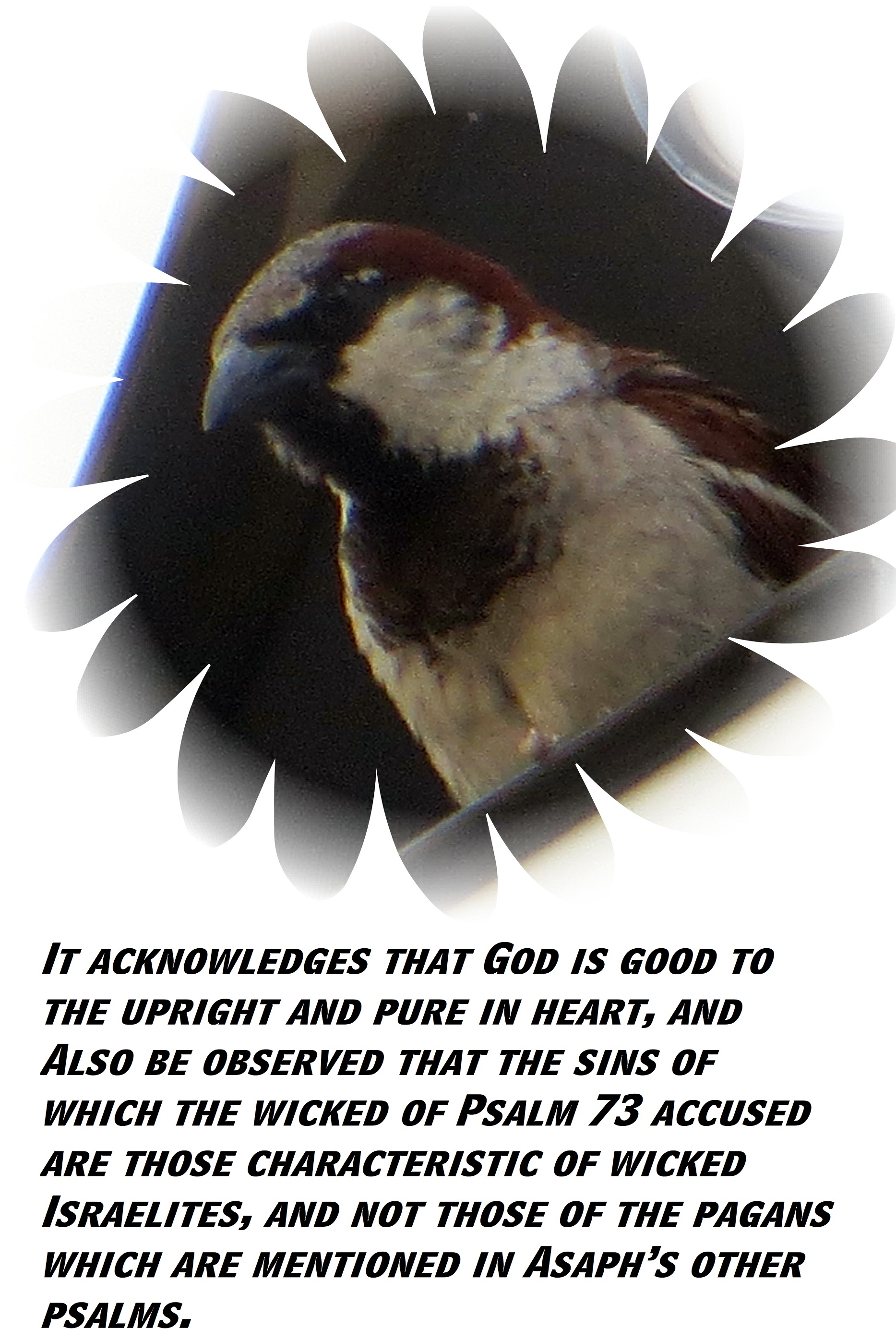 Psalm 73 is a psalm of Asaph, a singer, musician, and prophet of David and Solomon’s era. It is the first psalm of Book III of the Psalter, a collection of psalms that echoes themes from Psalms Ch:1&2. It depicts a journey of temptation and faithfulness, contrasting the prosperity of the wicked with the difficulties of the righteous. It acknowledges that God is good to the upright and pure in heart, and Also be observed that the sins of which the “wicked” of Psalm 73 accused are those characteristic of wicked Israelites, and not those of the pagans which are mentioned in Asaph’s other psalms. It is the prosperity of wicked Israelites which brought such distress to Asaph. I think I can understand why this would be true and that the wicked will perish. Just saying. BOOK III; Many of the psalms in Book Three (Psalms 73–89) are attributed to Asaph. He was a Levite musician appointed by David to lead the worship that surrounded the covenant chest in the congregation tent (1 Chronicles 16:4–6 NIV: He appointed some of the Levites to minister before the ark of the Lord, to extol, thank, and praise the Lord, the God of Israel: Asaph was the chief, and next to him in rank were Zechariah, then Jaaziel, Shemiramoth, Jehiel, Mattithiah, Eliab, Benaiah, Obed-Edom and Jeiel. They were to play the lyres and harps, Asaph was to sound the cymbals, and Benaiah and Jahaziel the priests were to blow the trumpets regularly before the ark of the covenant of God. ) {A psalm of Asaph.}
