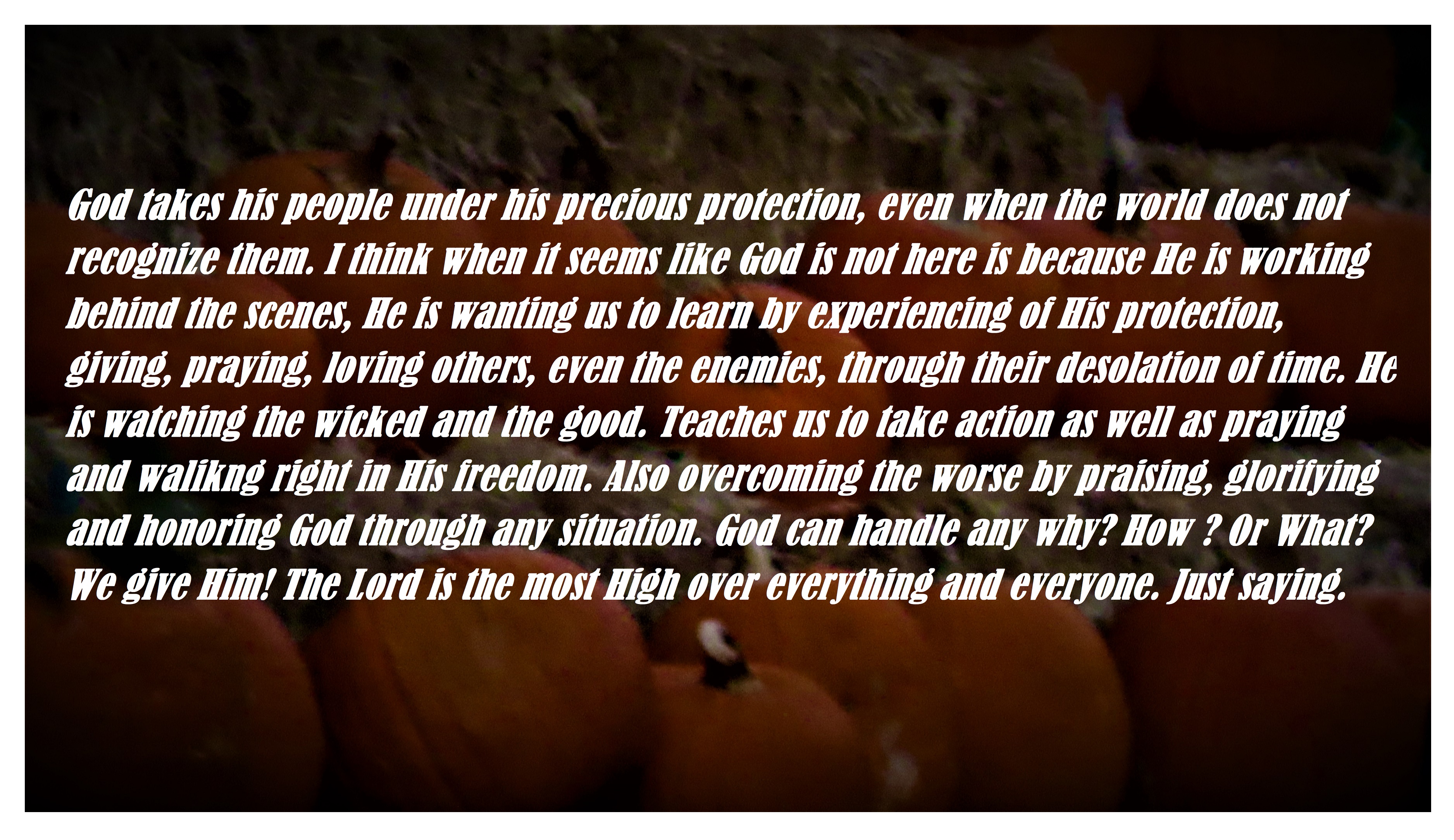 This is a psalm of Asaph that was likely written in response to the threats and insults of the enemies of the church, who sought its ruin. The psalmist appeals to God’s knowledge and justice, and prays for the defeat of the enemies’ attempts to destroy Israel, so that the church may be preserved, the enemies humbled, and God glorified. The psalm also emphasizes that God takes his people under his precious protection, even when the world does not recognize them. I think when it seems like God is not here is because He is working behind the scenes, He is wanting us to learn by experiencing of His protection, giving, praying, loving others, even the enemies, through their desolation of time. He is watching the wicked and the good. Teaches us to take action as well as praying and walking right in His freedom. Also overcoming the worse by praising, glorifying and honoring God through any situation. God can handle any why? How? Or What? We give Him! The Lord is the Most-High over everything and everyone. Just saying.