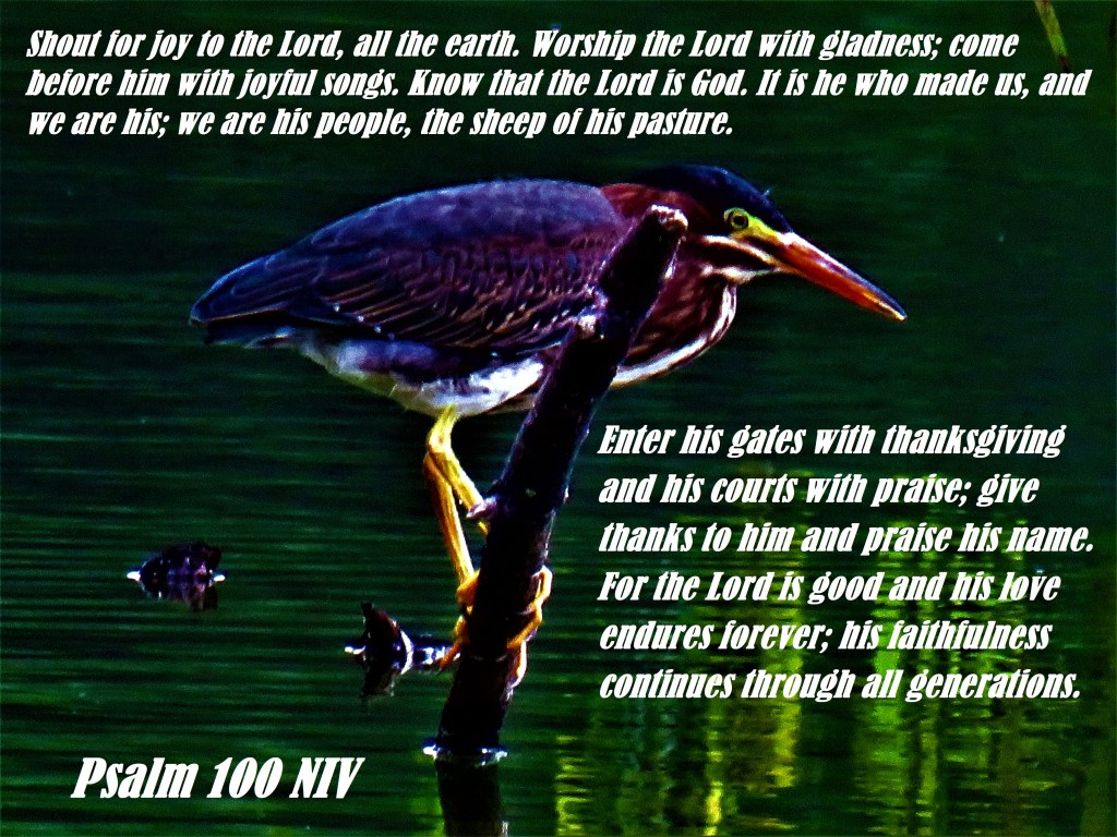 Shout for joy to the Lord, all the earth. Worship the Lord with gladness; come before him with joyful songs. Know that the Lord is God. It is he who made us, and we are his; we are his people, the sheep of his pasture. Enter his gates with thanksgiving and his courts with praise; give thanks to him and praise his name. For the Lord is good and his love endures forever; his faithfulness continues through all generations.
