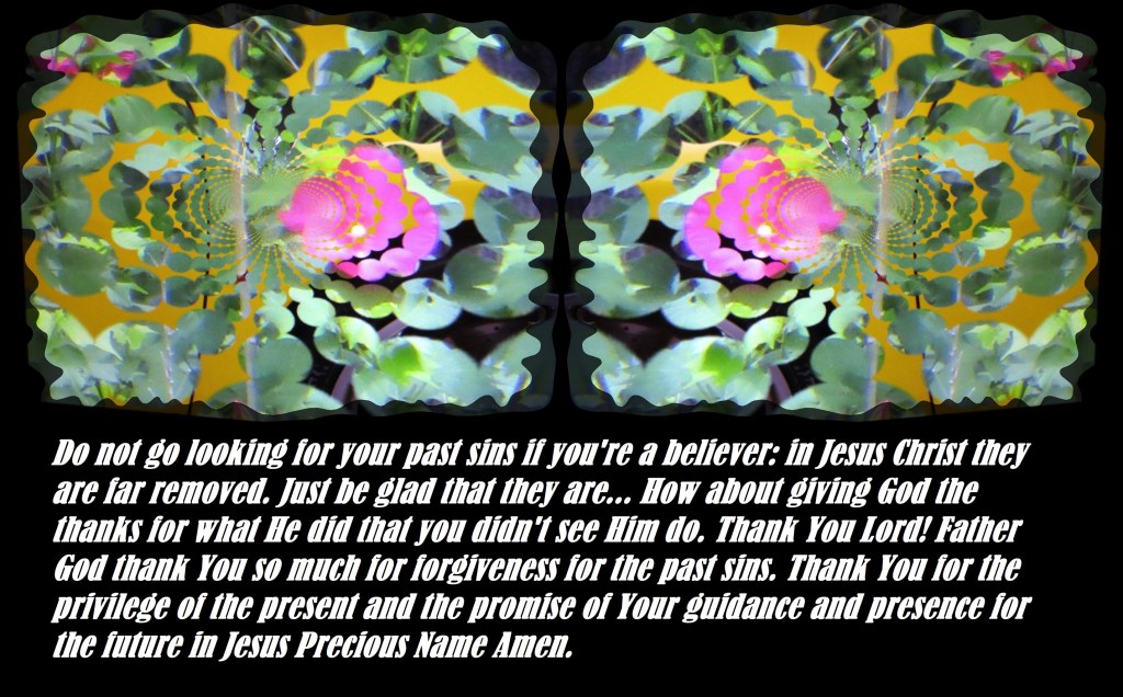 Do not go looking for your past sins if you’re a believer: in Jesus Christ they are far removed. Just be glad that they are… How about giving God the thanks for what He did that you didn’t see Him do. Thank You Lord! Father God thank You so much for forgiveness for the past sins. Thank You for the privilege of the present and the promise of Your guidance and presence for the future in Jesus Precious Name Amen.