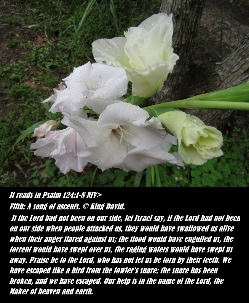If the Lord had not been on our side, let Israel say, if the Lord had not been on our side when people attacked us, they would have swallowed us alive when their anger flared against us; the flood would have engulfed us, the torrent would have swept over us, the raging waters would have swept us away. Praise be to the Lord, who has not let us be torn by their teeth. We have escaped like a bird from the fowler’s snare; the snare has been broken, and we have escaped. Our help is in the name of the Lord, the Maker of heaven and earth.