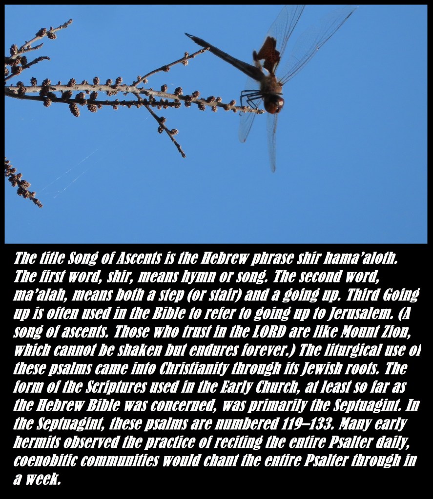 The title Song of Ascents is the Hebrew phrase shir hama’aloth. The first word, shir, means hymn or song. The second word, ma’alah, means both a step (or stair) and a going up. Third Going up is often used in the Bible to refer to going up to Jerusalem. (A song of ascents. Those who trust in the LORD are like Mount Zion, which cannot be shaken but endures forever.) The liturgical use of these psalms came into Christianity through its Jewish roots. The form of the Scriptures used in the Early Church, at least so far as the Hebrew Bible was concerned, was primarily the Septuagint. In the Septuagint, these psalms are numbered 119–133. Many early hermits observed the practice of reciting the entire Psalter daily, coenobitic communities would chant the entire Psalter through in a week.