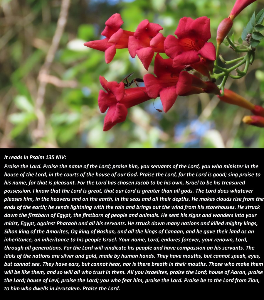 Praise for the one true Creator Lord God, Psalm 135 is of praise for the one true Creator Lord God. It begins and ends with “hallelujah” and urges the people to worship Him for his name, nature, and perfections. It also recounts The Lords’s works of creation, providence, and grace, and contrasts him with the worthless idols of the nations. The psalm may hint at the conversion of the people of the Messiah to the faith. The Lord God gave their land as an inheritance, an inheritance to his people Israel.
