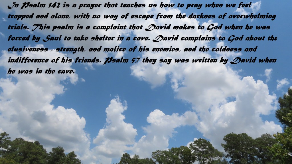 Psalm 142 is a prayer that teaches us how to pray when we feel trapped and alone, with no way of escape from the darkness of overwhelming trials. This psalm is a complaint that David makes to God when he was forced by Saul to take shelter in a cave. David complains to God about the elusiveness, strength, and malice of his enemies and the coldness and indifference of his friends. Psalm 57 they say was written by David when he was in the cave.
