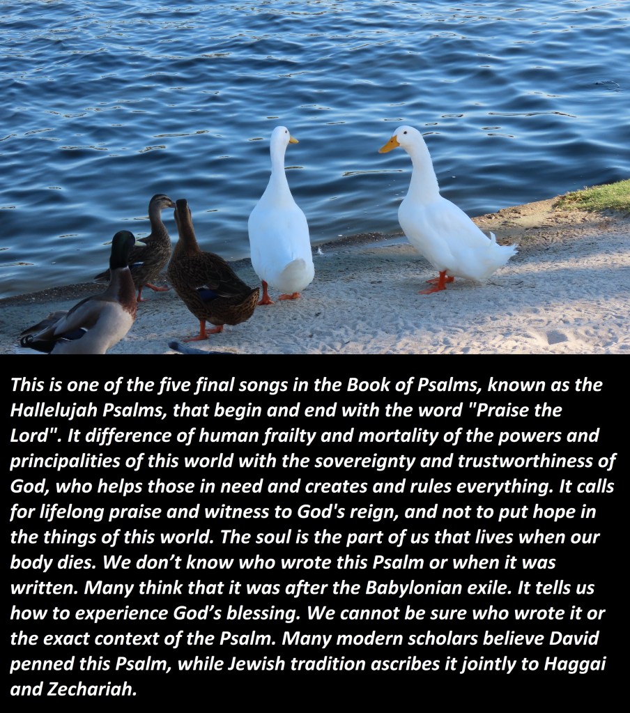 This is one of the five final songs in the Book of Psalms, known as the Hallelujah Psalms, that begin and end with the word “Praise the Lord”. It’s the difference between human frailty and mortality of the powers and principalities of this world with the sovereignty and trustworthiness of God, who helps those in need and creates and rules everything. It calls for lifelong praise and witness to God’s reign, and not to put hope in the things of this world. The soul is the part of us that lives when our body dies. We don’t know who wrote this Psalm or when it was written. Many think that it was after the Babylonian exile. It tells us how to experience God’s blessing. We cannot be sure who wrote it or the exact context of the Psalm. Many modern scholars believe David penned this Psalm, while Jewish tradition ascribes it jointly to Haggai and Zechariah.