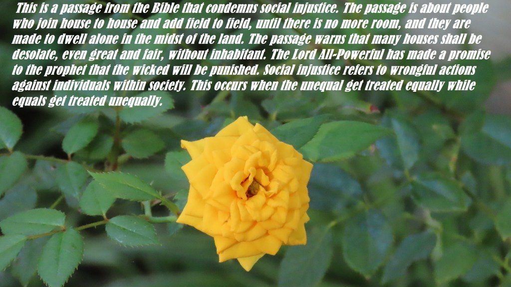 This is a passage from the Bible that condemns social injustice. The passage is about people who join house to house and add field to field, until there is no more room, and they are made to dwell alone in the midst of the land. The passage warns that many houses shall be desolate, even great and fair, without inhabitants. The Lord All-Powerful has made a promise to the prophet that the wicked will be punished. Social injustice refers to wrongful actions against individuals within society. This occurs when the unequal get treated equally while equals get treated unequally.