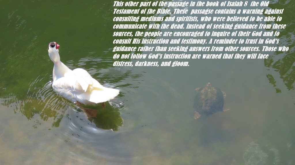 This other part of the passage in the book of Isaiah 8 the Old Testament of the Bible. This passage contains a warning against consulting mediums and spiritists, who were believed to be able to communicate with the dead. Instead of seeking guidance from these sources, the people are encouraged to inquire of their God and to consult His instruction and testimony. A reminder to trust in God’s guidance rather than seeking answers from other sources. Those who do not follow God’s instruction are warned that they will face distress, darkness, and gloom.