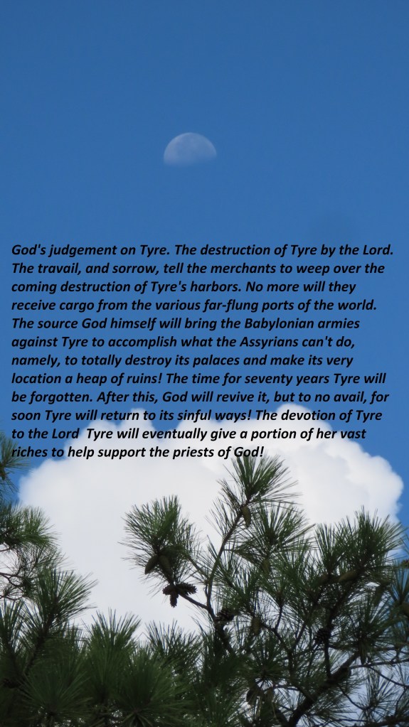 GOD’S JUDGMENT ON TYRE. The destruction of Tyre by the Lord. The travail, and sorrow, tell the merchants to weep over the coming destruction of Tyre’s harbors. No more will they receive cargo from the various far-flung ports of the world. The source God himself will bring the Babylonian armies against Tyre to accomplish what the Assyrians can’t do, namely, to totally destroy its palaces and make its very location a heap of ruins! The time for seventy years Tyre will be forgotten. After this, God will revive it, but to no avail, for soon Tyre will return to its sinful ways! The devotion of Tyre to the Lord Tyre will eventually give a portion of her vast riches to help support the priests of God!