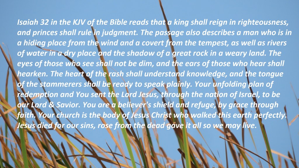 Isaiah 32 in the KJV of the Bible reads that a king shall reign in righteousness, and princes shall rule in judgment. The passage also describes a man who is in a hiding place from the wind and a covert from the tempest, as well as rivers of water in a dry place and the shadow of a great rock in a weary land. The eyes of those who see shall not be dim, and the ears of those who hear shall hearken. The heart of the rash shall understand knowledge, and the tongue of the stammerers shall be ready to speak plainly. Your unfolding plan of redemption and You sent the Lord Jesus, through the nation of Israel, to be our Lord & Savior. You are a believer’s shield and refuge, by grace through faith. Your church is the body of Jesus Christ who walked this earth perfectly. Jesus died for our sins, rose from the dead gave it all so we may live.