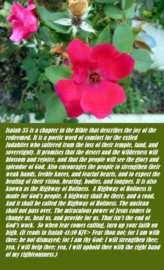 Isaiah 35 this is a chapter in the Bible that describes the joy of the redeemed. It is a poetic word of comfort for the exiled Judahites who suffered from the loss of their temple, land, and sovereignty. It promises that the desert and the wilderness will blossom and rejoice and that the people will see the glory and splendor of God. Also encourages the people to strengthen their weak hands, feeble knees, and fearful hearts, and to expect the healing of their vision, hearing bodies, and tongues. It is also known as the Highway of Holiness. A Highway of Holiness is made for God’s people. A highway shall be there, and a road And it shall be called the Highway of Holiness. The unclean shall not pass over. The miraculous power of Jesus comes to change us, heal us, and provide for us. That isn’t the end of God’s work. So when fear comes calling, turn up your faith on high. (It reads in Isaiah 41:10 KJV> Fear thou not; for I am with thee: be not dismayed; for I am thy God: I will strengthen thee; yea, I will help thee; yea, I will uphold thee with the right hand of my righteousness.)