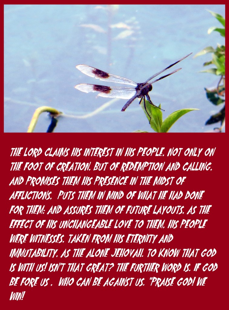 The Lord claims his interest in his people, not only on the foot of creation, but of redemption and calling, and promises them his presence in the midst of afflictions, puts them in mind of what he had done for them; and assures them of future layouts, as the effect of his unchangeable love to them, his people were witnesses, taken from his eternity and immutability, as the alone Jehovah. To know that God is with us! Isn’t that great? The further word is. If God be fore us , who can be against us. “praise God! We win!
