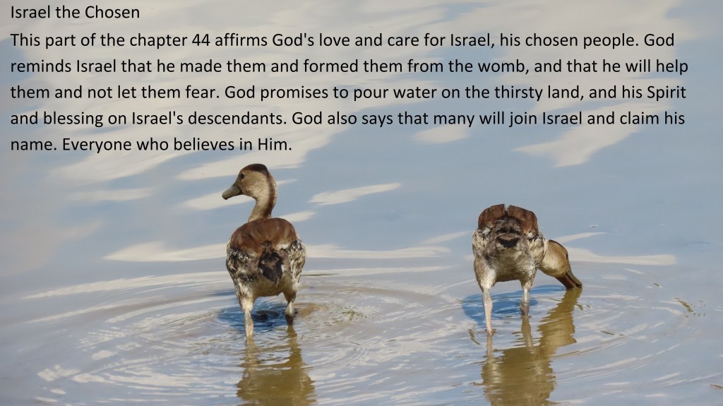 This part of the chapter 44 affirms God’s love and care for Israel, his chosen people. God reminds Israel that he made them and formed them from the womb, and that he will help them and not let them fear. God promises to pour water on the thirsty land, and his Spirit and blessing on Israel’s descendants. God also says that many will join Israel and claim his name. Everyone who believes in Him.