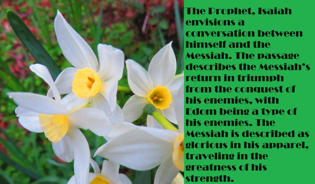 The prophet Isaiah envisions a conversation between himself and the Messiah. The passage describes the Messiah’s return in triumph from the conquest of his enemies, with Edom being a type of his enemies. The Messiah is described as glorious in his apparel, traveling in the greatness of his strength.