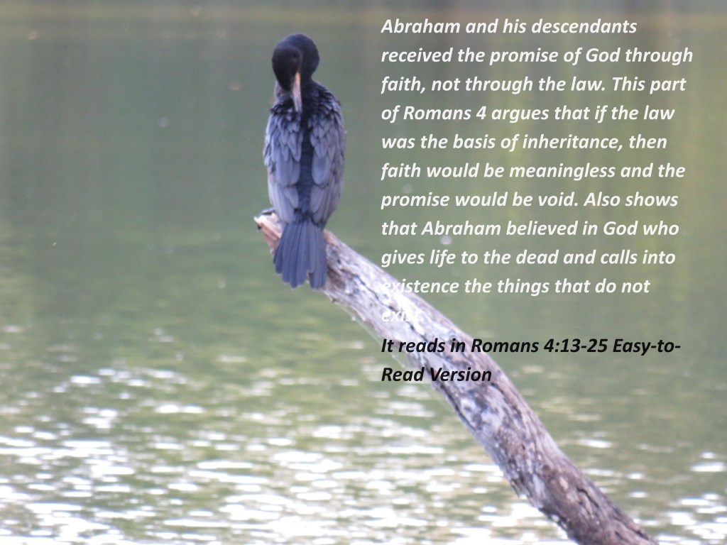 Abraham and his descendants received the promise of God through faith, not through the law. This part of Romans 4 argues that if the law was the basis of inheritance, then faith would be meaningless and the promise would be void. Also shows that Abraham believed in God who gives life to the dead and calls into existence the things that do not exist.