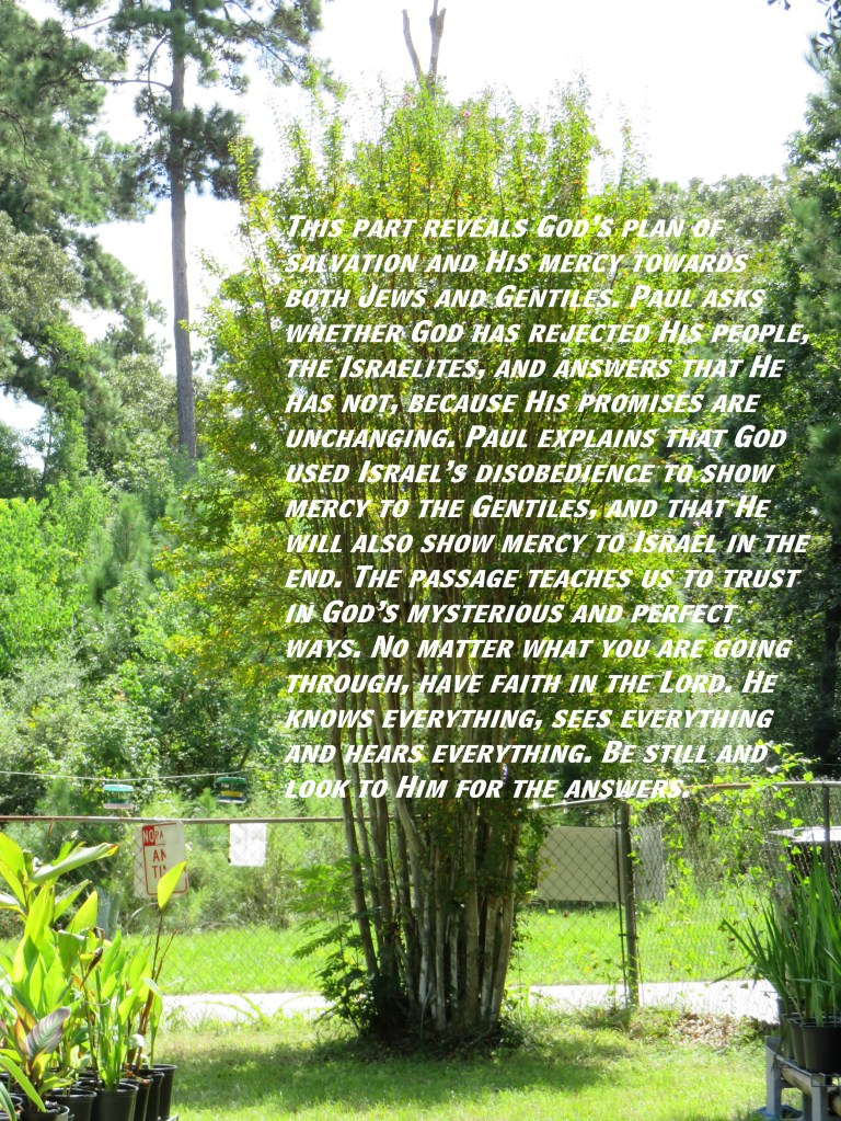 This part reveals God’s plan of salvation and His mercy towards both Jews and Gentiles. Paul asks whether God has rejected His people, the Israelites, and answers that He has not, because His promises are unchanging. Paul explains that God used Israel’s disobedience to show mercy to the Gentiles, and that He will also show mercy to Israel in the end. The passage teaches us to trust in God’s mysterious and perfect ways. No matter what you are going through, have faith in the Lord. He knows everything, sees everything and hears everything. Be still and look to Him for the answers.