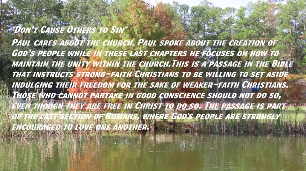 Paul cares about the church. Paul spoke about the creation of God’s people while in these last chapters he focuses on how to maintain the unity within the church.This is a passage in the Bible that instructs strong-faith Christians to be willing to set aside indulging their freedom for the sake of weaker-faith Christians. Those who cannot partake in good conscience should not do so, even though they are free in Christ to do so. The passage is part of the last section of Romans, where God’s people are strongly encouraged to love one another.