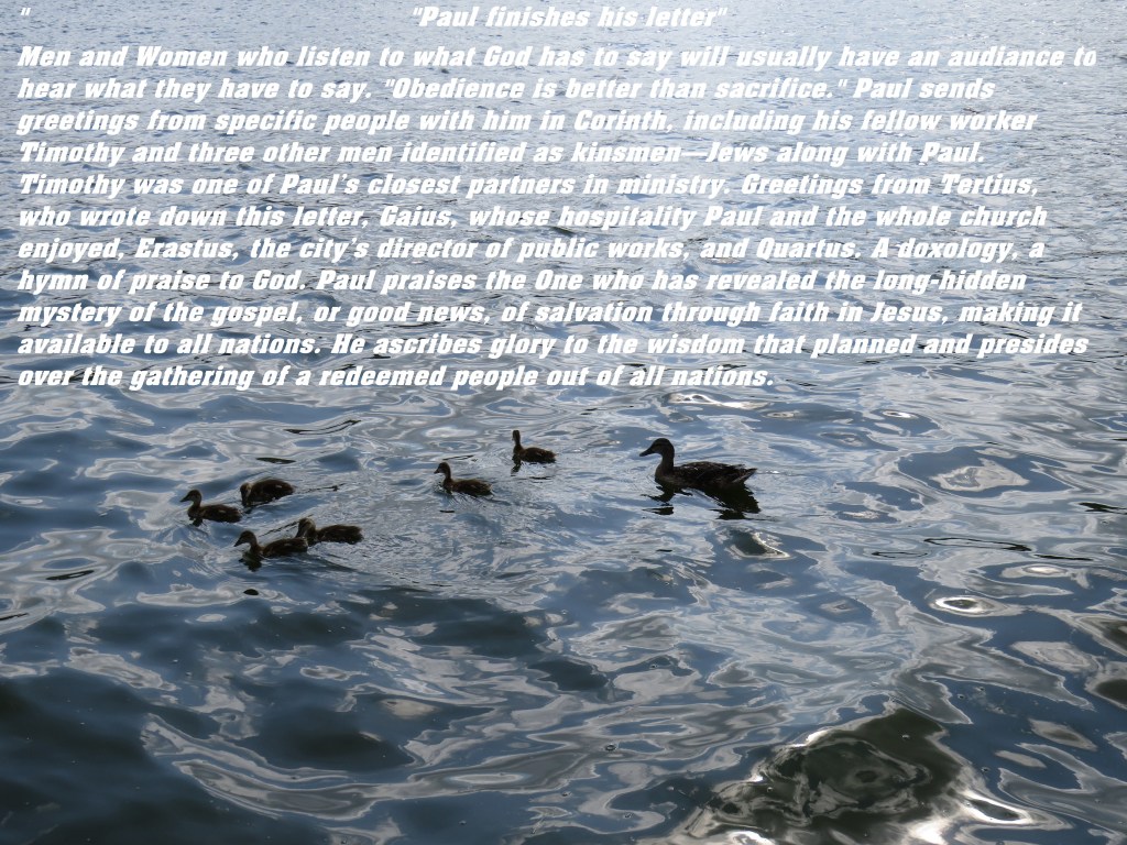 Men and Women who listen to what God has to say will usually have an audiance to hear what they have to say. “Obedience is better than sacrifice.” Paul sends greetings from specific people with him in Corinth, including his fellow worker Timothy and three other men identified as kinsmen—Jews along with Paul. Timothy was one of Paul’s closest partners in ministry. Greetings from Tertius, who wrote down this letter, Gaius, whose hospitality Paul and the whole church enjoyed, Erastus, the city’s director of public works, and Quartus. A doxology, a hymn of praise to God. Paul praises the One who has revealed the long-hidden mystery of the gospel, or good news, of salvation through faith in Jesus, making it available to all nations. He ascribes glory to the wisdom that planned and presides over the gathering of a redeemed people out of all nations.