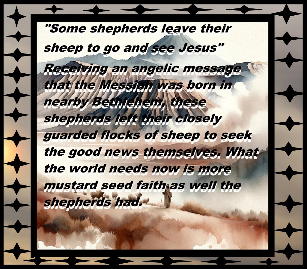 Receiving an angelic message that the Messiah was born in nearby Bethlehem, these shepherds left their closely guarded flocks of sheep to seek the good news themselves. What the world needs now is more mustard seed faith as the shepherds had.