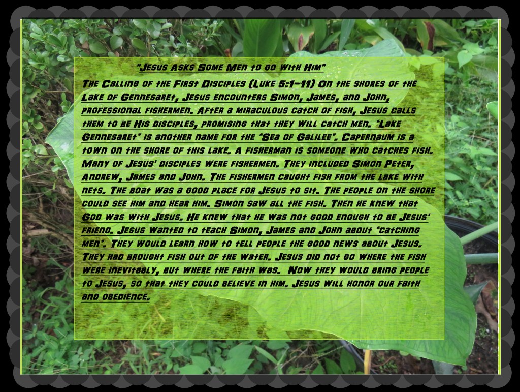 It reads in Luke 5:1-11 EASY> One day, Jesus was standing on the shore of Lake Gennesaret. A crowd was pushing to get near to him. They were listening to him. He was speaking God’s message to them. Jesus saw two fishing boats at the edge of the lake. The fishermen had left the boats there and they were now washing their nets. One of the boats belonged to Simon. Jesus climbed into it. He asked Simon to push it away from the shore. Jesus sat in the boat, and he started to teach the people. When Jesus had finished teaching, he said to Simon, ‘Now take the boat out into deep water. Then put the nets into the water to catch some fish.’ Simon replied, ‘Teacher, we worked all last night, and we did not catch anything. But because you say it, I will put the nets into the water again.’ So they went in their boats, and they put the nets down into the water. When they did that, they caught many fish. There were so many fish that the nets began to break. So they made signs to the fishermen in the other boat. They told the other fishermen to come and help. So the other men came in their boat. They filled both boats with the fish. There were so many fish that the boats began to go down under the water. When Simon saw all the fish, he went down on his knees in front of Jesus. ‘Sir,’ he said, ‘I am a bad man. So please go away from me.’ Simon and his friends were very surprised. They were all surprised because they had caught so many fish. Zebedee’s sons, James and John, were fishermen who worked with Simon. They were also surprised. Jesus said to Simon, ‘Do not be afraid. You have been catching fish. From now on you will catch people. After that, they went and they pulled their boats up on the shore. Then they left everything behind and they went with Jesus.