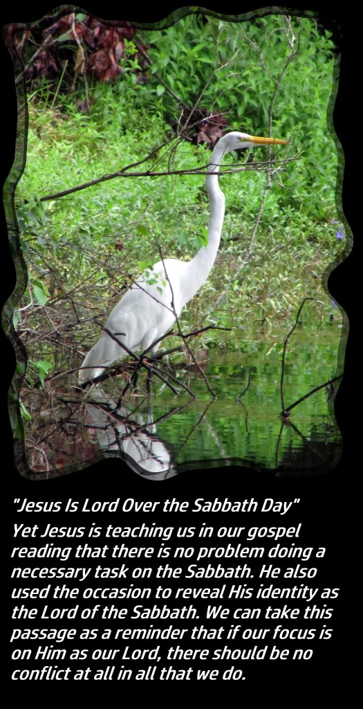 Yet Jesus is teaching us in our gospel reading that there is no problem doing a necessary task on the Sabbath. He also used the occasion to reveal His identity as the Lord of the Sabbath. We can take this passage as a reminder that if our focus is on Him as our Lord, there should be no conflict at all in all that we do.