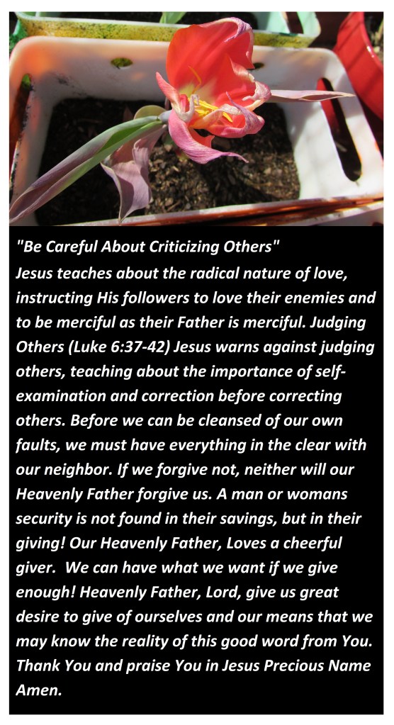 Jesus teaches about the radical nature of love, instructing His followers to love their enemies and to be merciful as their Father is merciful. Judging Others (Luke 6:37-42) Jesus warns against judging others, teaching about the importance of self-examination and correction before correcting others. Before we can be cleansed of our own faults, we must have everything in the clear with our neighbor. If we forgive not, neither will our Heavenly Father forgive us. A man or womans security is not found in their savings, but in their giving! Our Heavenly Father, Loves a cheerful giver. We can have what we want if we give enough! Heavenly Father, Lord, give us great desire to give of ourselves and our means that we may know the reality of this good word from You. Thank You and praise You in Jesus Precious Name Amen.