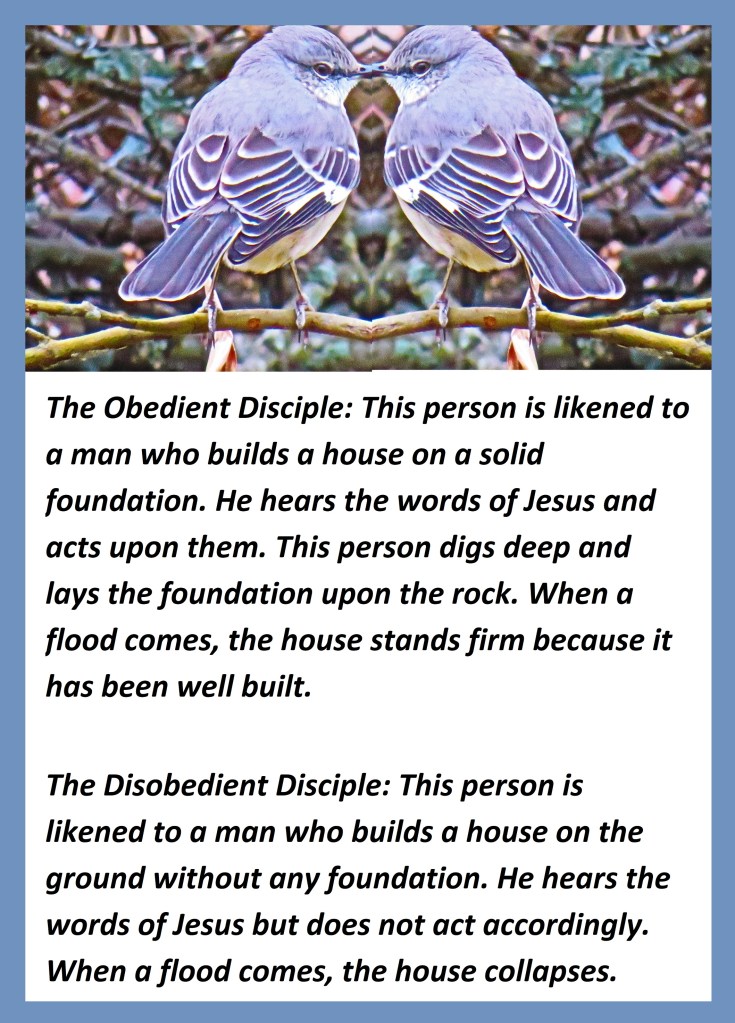 The Obedient Disciple: This person is likened to a man who builds a house on a solid foundation. He hears the words of Jesus and acts upon them. This person digs deep and lays the foundation upon the rock. When a flood comes, the house stands firm because it has been well built.