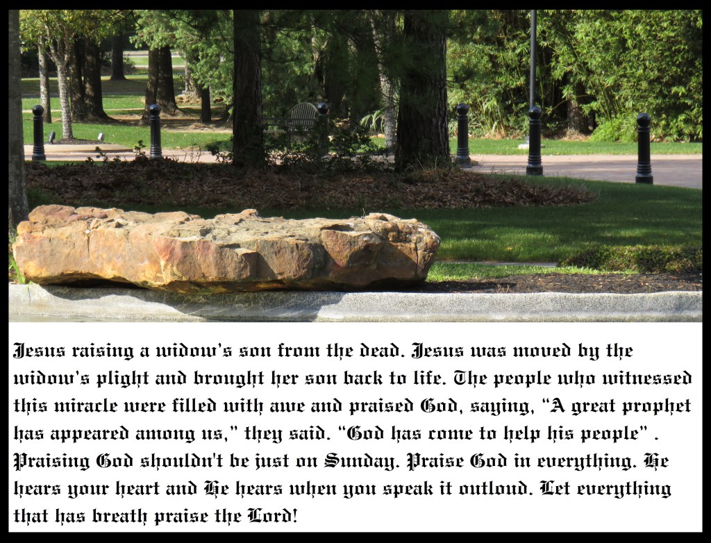 Jesus raising a widow’s son from the dead. Jesus was moved by the widow’s plight and brought her son back to life. The people who witnessed this miracle were filled with awe and praised God, saying, “A great prophet has appeared among us,” they said. “God has come to help his people” . Praising God shouldn’t be just on Sunday. Praise God in everything. He hears your heart and He hears when you speak it outloud. Let everything that has breath praise the Lord!