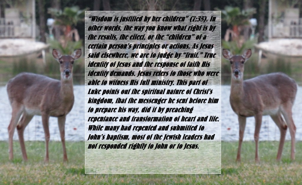 “Wisdom is justified by her children” (7:35). In other words, the way you know what right is by the results, the effect, or the “children” of a certain person’s principles or actions. As Jesus said elsewhere, we are to judge by “fruit.” True identity of Jesus and the response of faith His identity demands. Jesus refers to those who were able to witness His full ministry. This part of Luke points out the spiritual nature of Christ’s kingdom, that the messenger he sent before him to prepare his way, did it by preaching repentance and transformation of heart and life. While many had repented and submitted to John’s baptism, most of the Jewish leaders had not responded rightly to John or to Jesus.